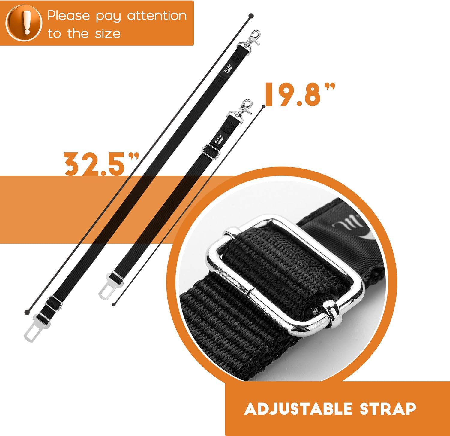 - Our dog car harness is designed to give your dog the comfort and safety she/he needs in the car. It can be easily adjusted from 19.8 to 32.5 inches in length to fit every size of dog and give them a suitable space to move around.