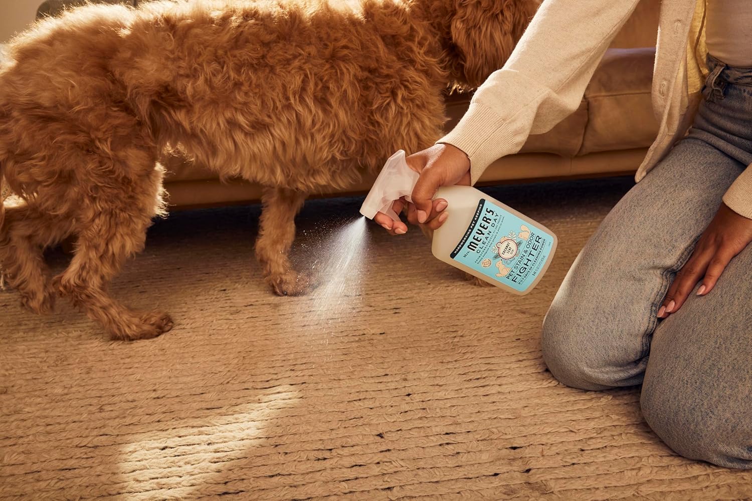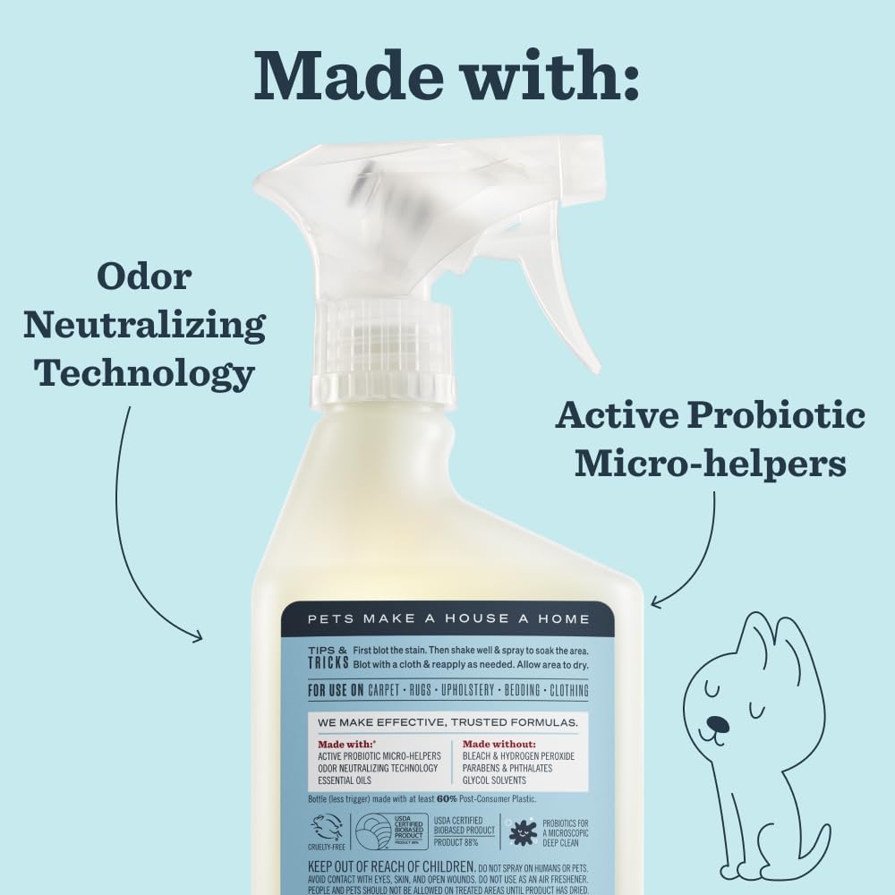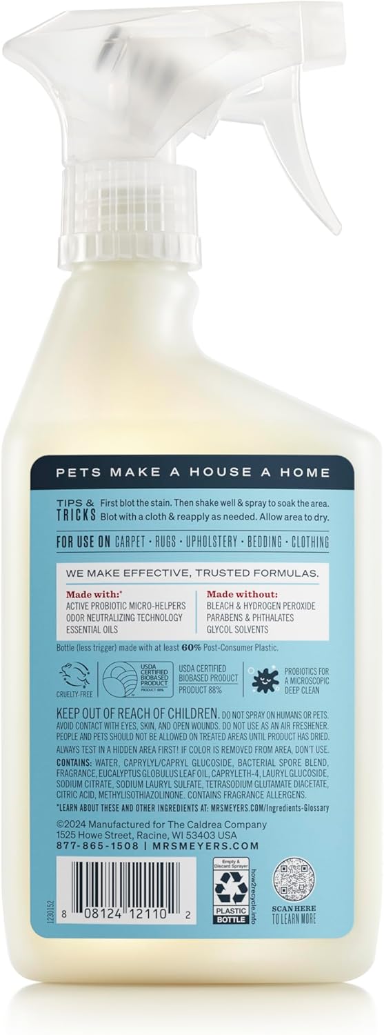 Mrs. Meyer’s Clean Day for your pets. Our new Stain & Odor Fighter is tough on pet messes and accidents but friendly on whiskers and paws. With scents designed with people and pets in mind, this hardworking product fights pet stains and odors for up to 7 days with the power of probiotics for all your soft surfaces—from carpets, rugs and couches to bedding, upholstery, and clothing. Because everybody (especially our pets!) oops sometimes.
