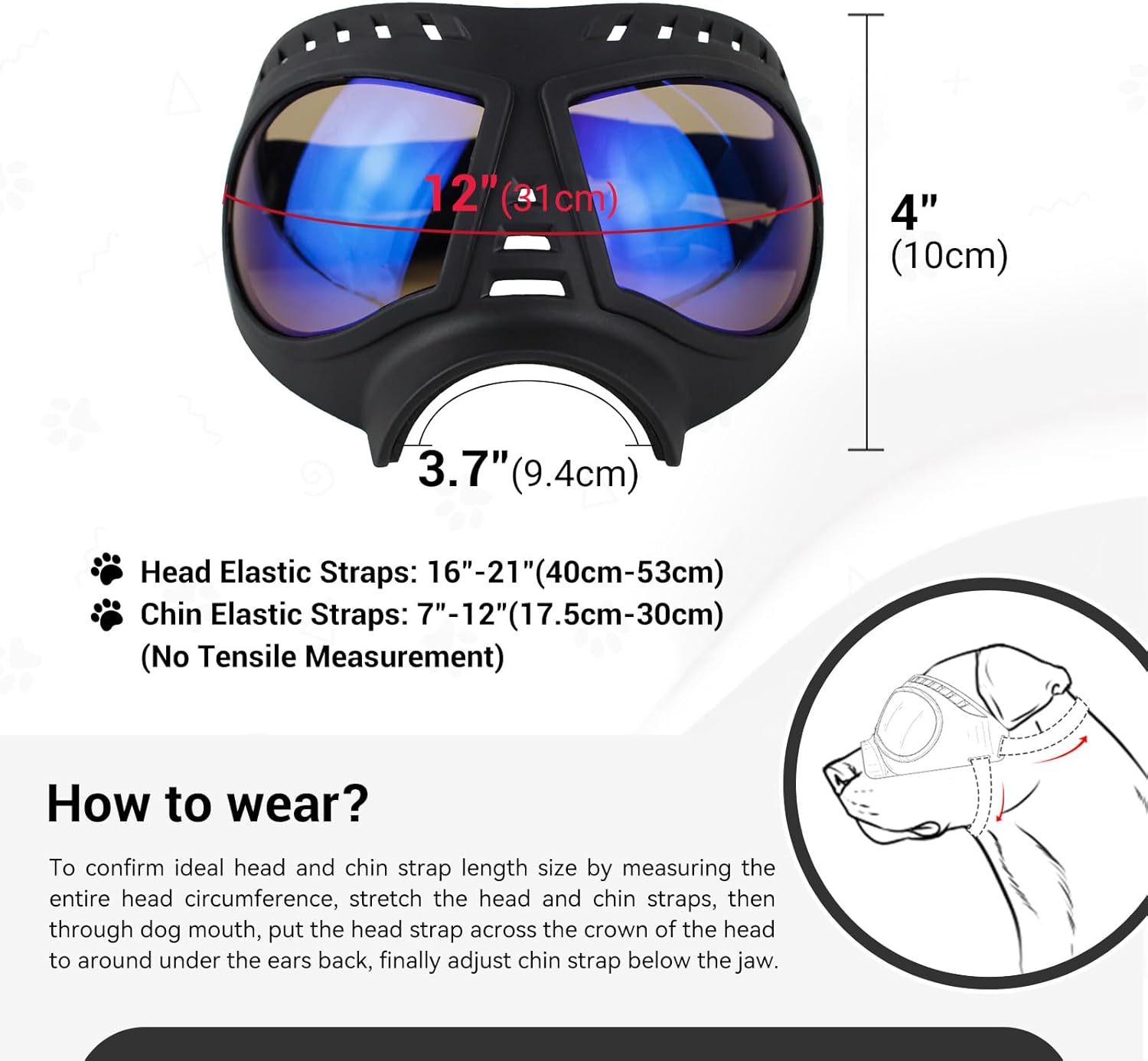 - Our large dog goggles accord with UV rate standard, lenses are UV-resistant and anti-glare. Frame vents can disperse the inside fog, improve the safety of protecting dog's eyes.