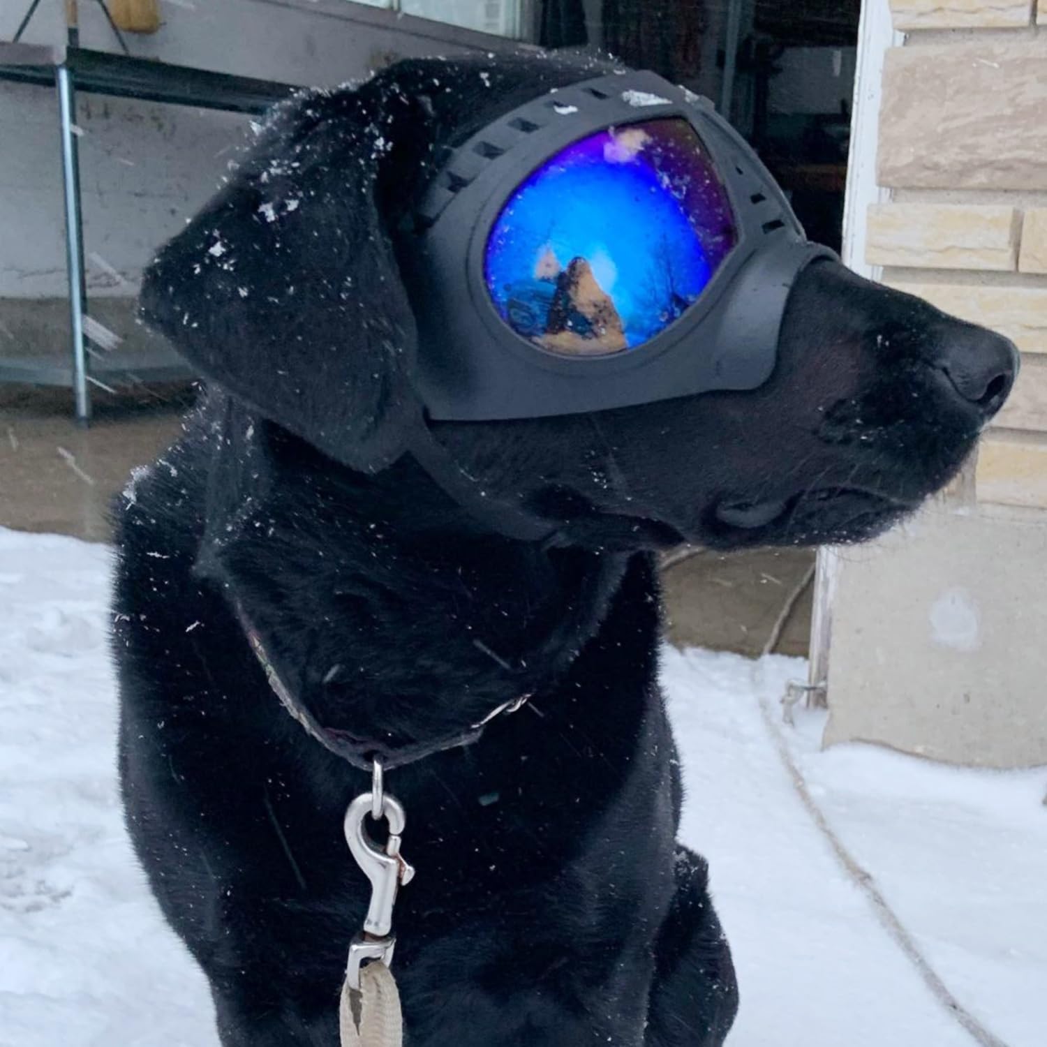 - Wide clear pet glasses can stay in the dog's head pretty well without scraping dog's face and eyes. Prevent droplets, tiny stone into dog eyes when dog stick the head out the window on car, SUV. Protect dogs when they runing, skiing, traveling. They are great equipment for outdoor eye protection