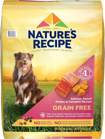 - GRAIN FREE DOG FOOD: Contains one (1) 24 lb bag of Nature’s Recipe Grain Free Salmon, Sweet Potato & Pumpkin Recipe dry dog food