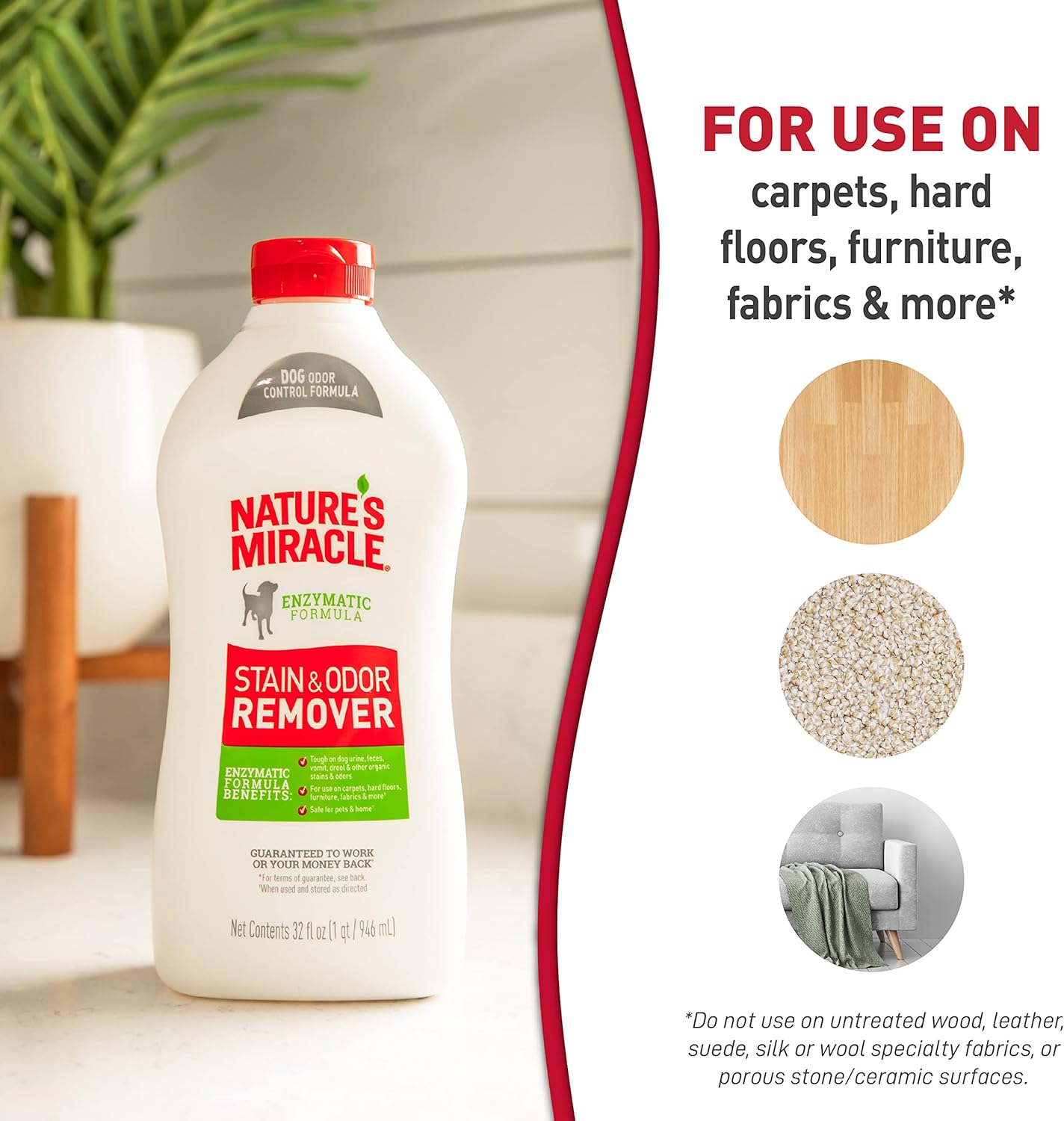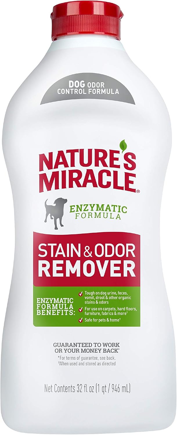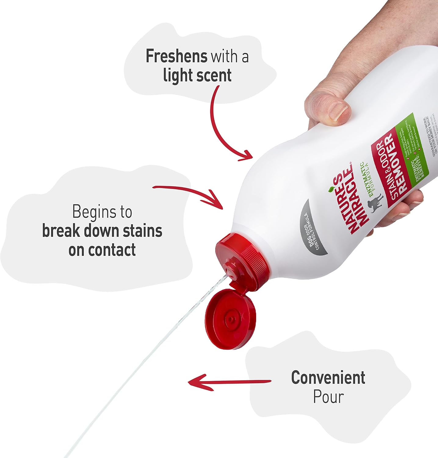 Nature’s Miracle has been a trusted brand for pet mess cleanup for more than 35 years. Whatever pets do, you can trust Nature’s Miracle pet stain and odor removers and disinfectants to undo. Accidents happen, as every dog owner knows. Nature’s Miracle Stain & Odor Remover for dogs is an enzymatic spot stain and odor remover that’s tough on dog urine, feces, vomit, drool and other organic stains while freshening with a light scent! Bottle update with easy pour makes cleanup easier. Bacteria-based formulas produce enzymes when they come into contact with a food source – pet urine, feces, vomit and other bio-based messes. This enzymatic cleaner continues working as long as the food source is present. For use on carpets, hard floors, furniture, fabrics and more. * Do not use on untreated hardwood, leather, suede, silk or wool specialty fabrics. Always use this product at full strength. Just soak the affected area, allow to work for 15 minutes, then blot up stain with a clean cloth. For tough odors, re-treat by thoroughly soaking affected area and allowing to air dry. When used and stored as directed, this product is safe to use around your pets and in your home. Always use Nature’s Miracle products first. Other cleaners and detergents may fail and chemically “set” stains that will be impossible to remove. *When used and stored as directed.