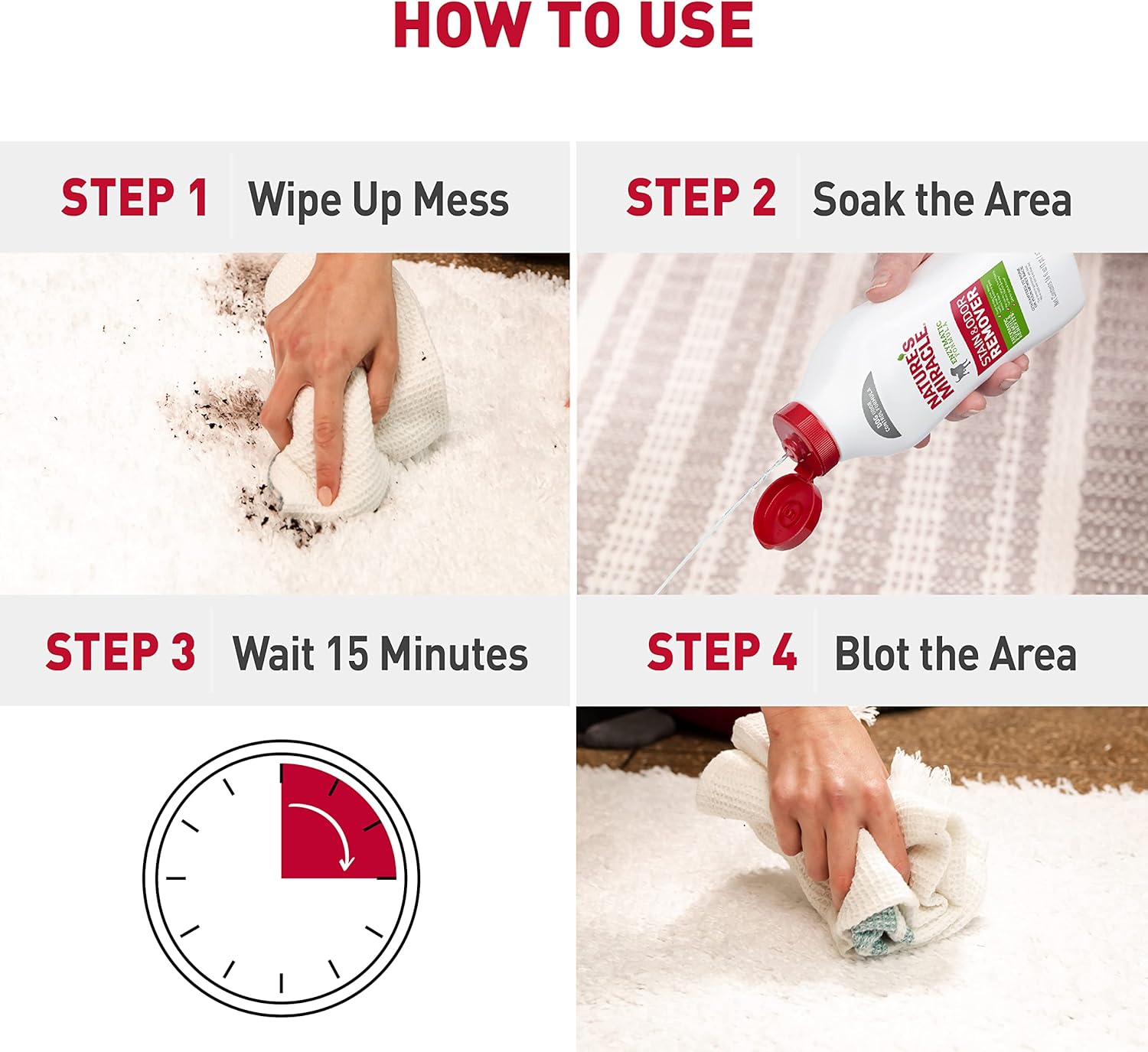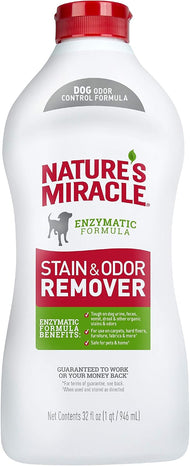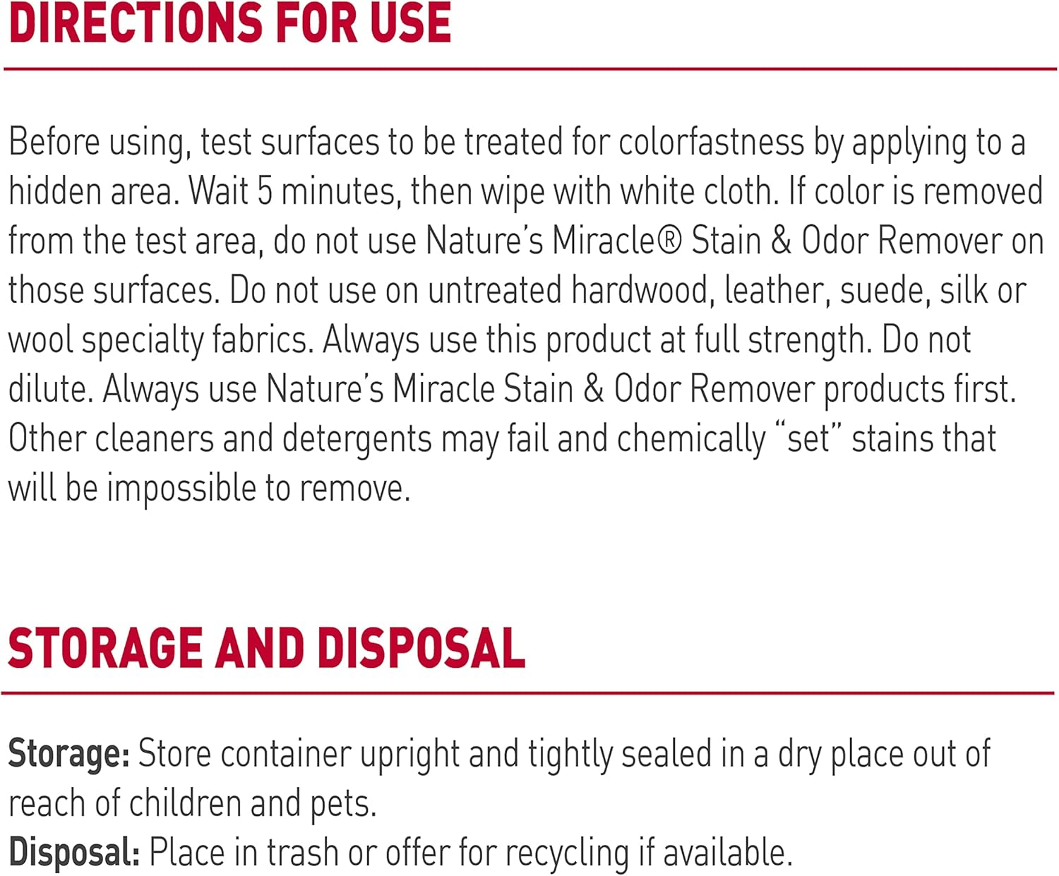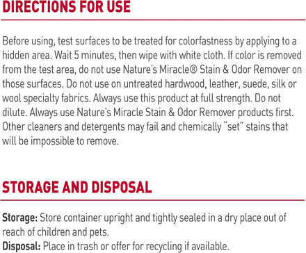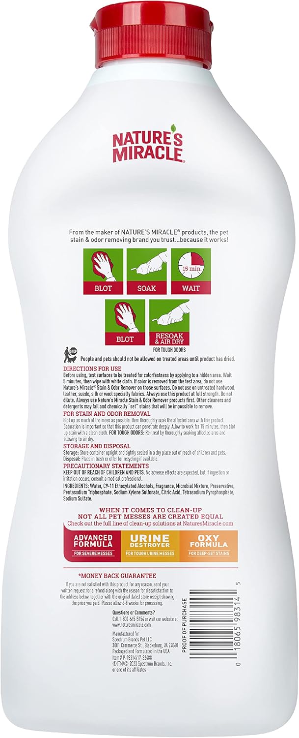 Nature’s Miracle has been a trusted brand for pet mess cleanup for more than 35 years. Whatever pets do, you can trust Nature’s Miracle pet stain and odor removers and disinfectants to undo. Accidents happen, as every dog owner knows. Nature’s Miracle Stain & Odor Remover for dogs is an enzymatic spot stain and odor remover that’s tough on dog urine, feces, vomit, drool and other organic stains while freshening with a light scent! Bottle update with easy pour makes cleanup easier. Bacteria-based formulas produce enzymes when they come into contact with a food source – pet urine, feces, vomit and other bio-based messes. This enzymatic cleaner continues working as long as the food source is present. For use on carpets, hard floors, furniture, fabrics and more. * Do not use on untreated hardwood, leather, suede, silk or wool specialty fabrics. Always use this product at full strength. Just soak the affected area, allow to work for 15 minutes, then blot up stain with a clean cloth. For tough odors, re-treat by thoroughly soaking affected area and allowing to air dry. When used and stored as directed, this product is safe to use around your pets and in your home. Always use Nature’s Miracle products first. Other cleaners and detergents may fail and chemically “set” stains that will be impossible to remove. *When used and stored as directed.