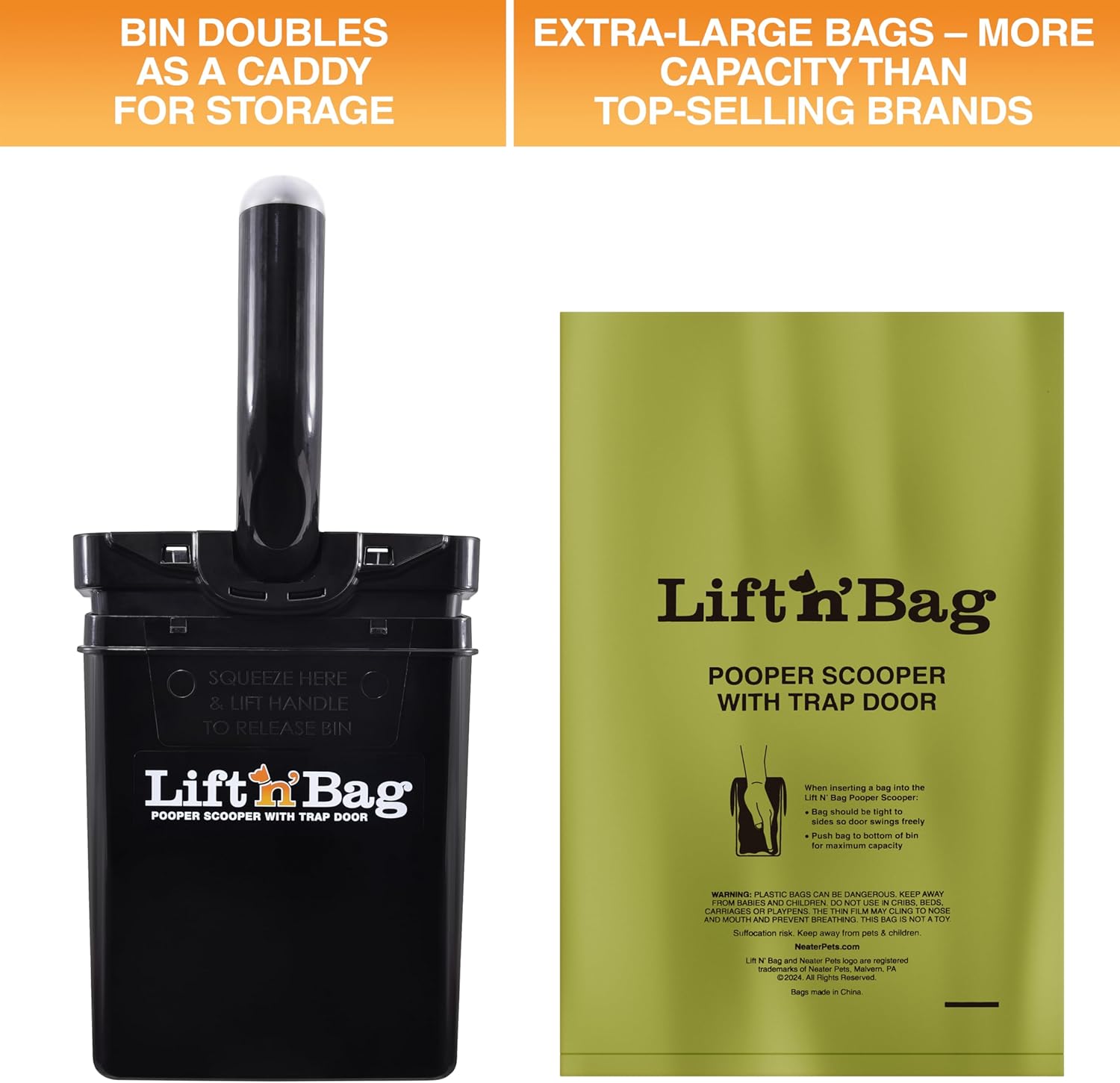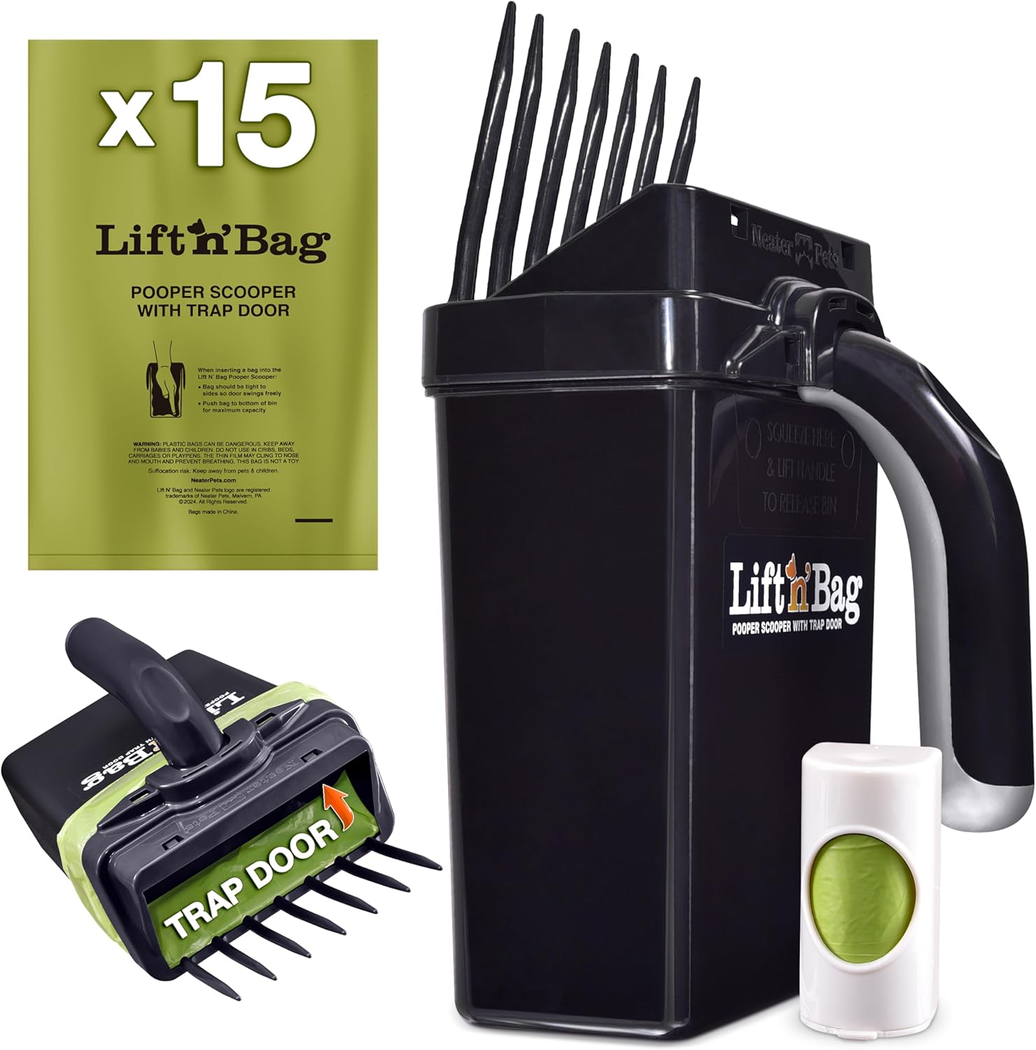 - WASTE BAGS & DISPENSER INCLUDED: Includes 15 bags with a lavender scent for odor control and a dispenser to attach to a leash or wherever you store the dog poop scoop. These bags are larger than standard pet waste bags and custom-fit for the Lift N’ Bag. For refills, choose Lift N’ Bag refill bags for a perfect fit. However, some other large pet waste bags will work.