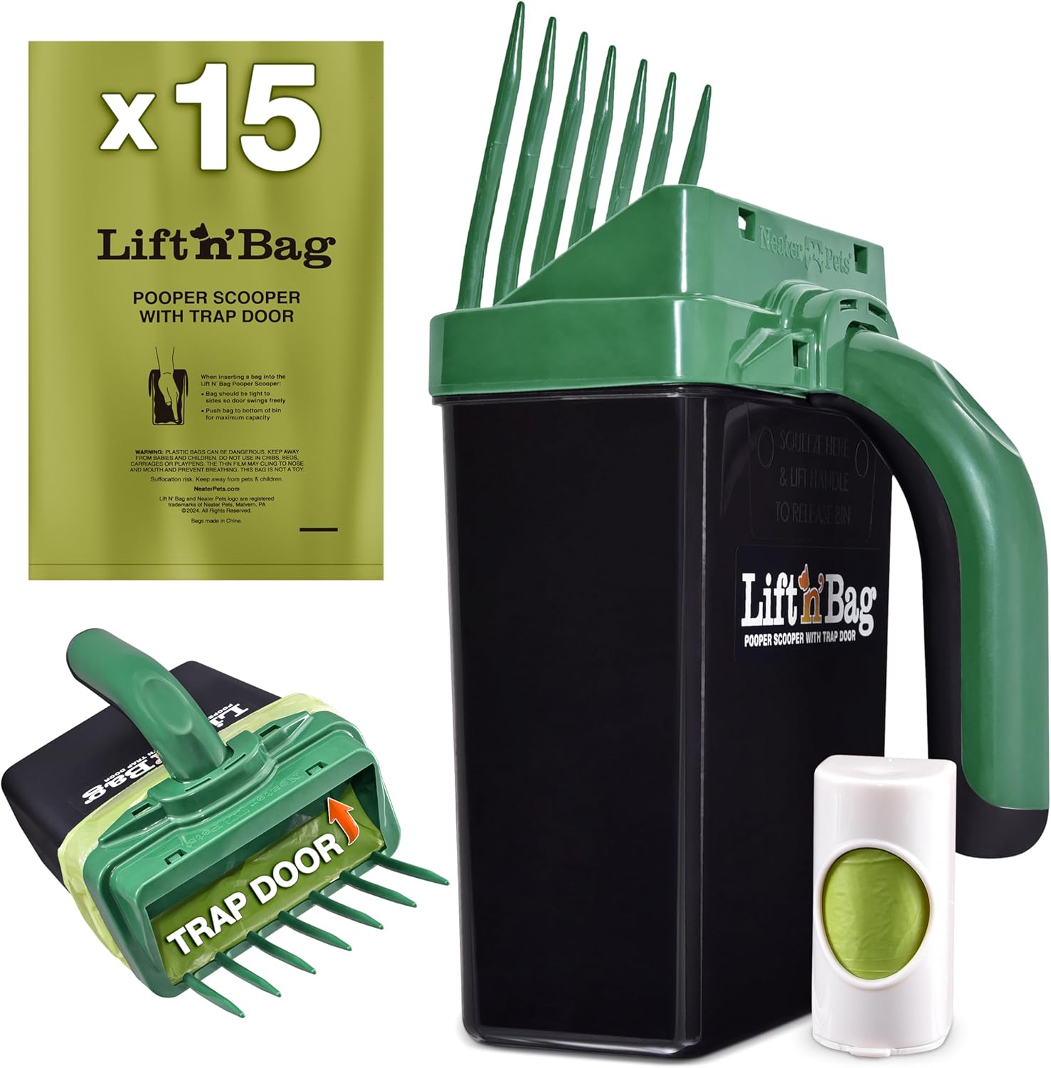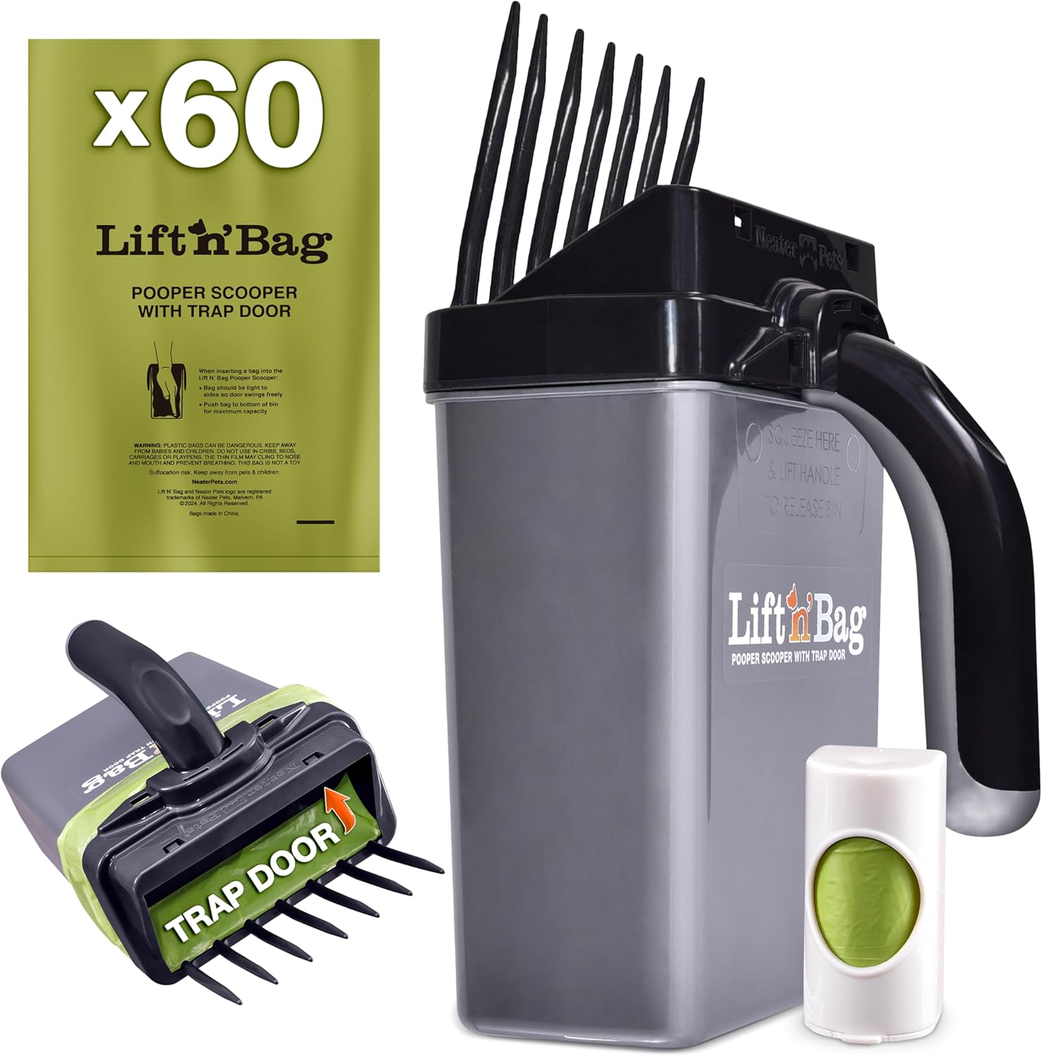 - SAVE MONEY ON BAGS!: Lift N’ Bag dog poop picker upper has a unique trap door that closes between scoops to reduce odor and keep waste contained, so you can pick up multiple poops (5-10 piles depending on size) with one bag, making one roll of bags lasts 5-10 times longer – reducing plastic waste and saving time & money.