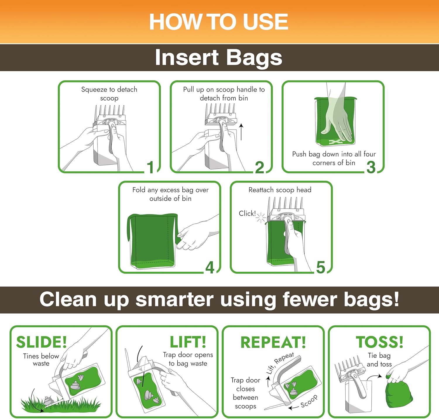 - ONE-HANDED OPERATION: The ergonomic handle and scoop-to-bag design let you quickly bag waste with just one hand for effortless pet waste removal on grass, dirt, gravel, and pavement. For smaller pieces, scoop so that the waste is horizontal, covering multiple tines.