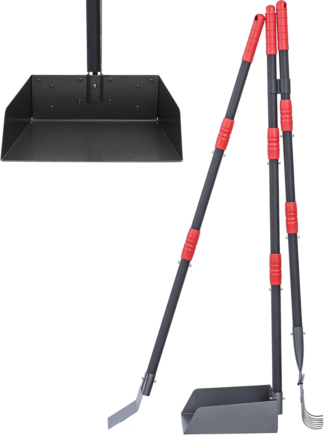 - Lightweight and Durable Construction: The handle is made of premium stainless steel, and a plastic sleeve is installed on the top. The rake and tray are treated with antirust coating. So there’s no need to worry about using your new scoop in wet or stormy weather.