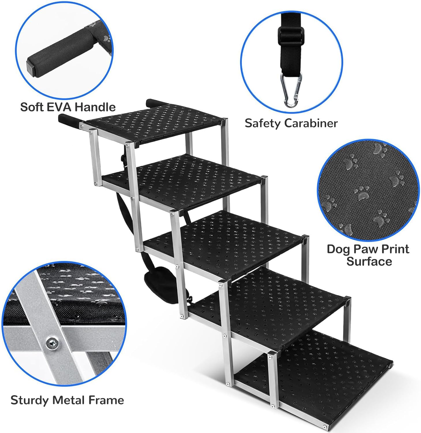 - Sturdy and Durable: The dog car ramp is made of high-grade metal, and the overall frame is stable, which can bear up to 200 lbs, ensuring that the dog will not shake when going up and down the stairs. The handle with foam can increase friction, provide a double layer of security for the stability of the dog ladder, and also help to avoid scratching the car trunk