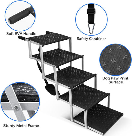 - Easy to Use: Dog stairs for car doesn't require any installation, just one pull to use it right away, simple and convenient. Tip: For first time use you can acclimatize your pet to the steps with the help of food