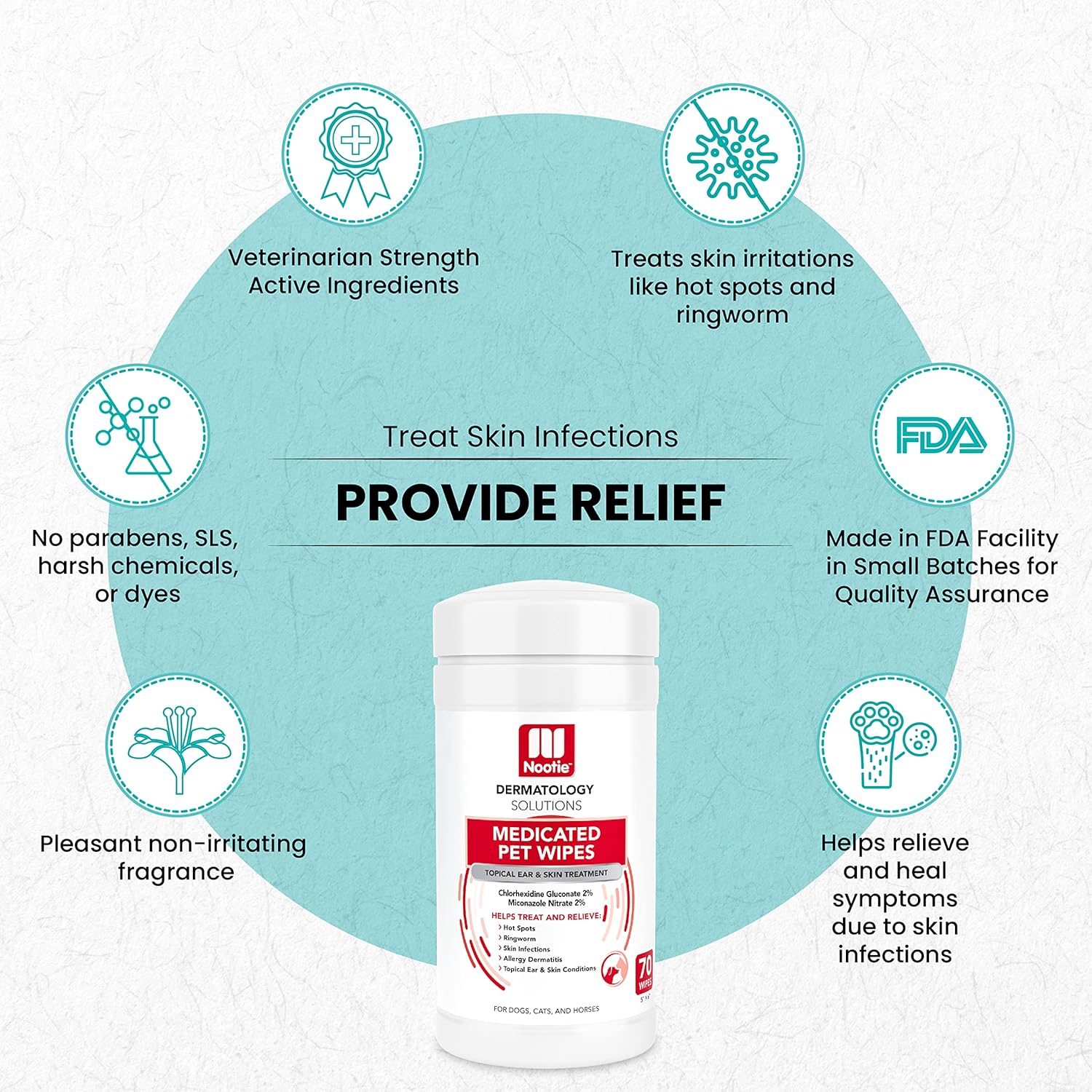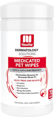 Nootie Medicated Pet Wipes - These medicated XL wipes for dogs and cats are ideal for treating symptoms of ringworm, hotspots, allergy dermatitis, and ear and skin infections. These medicated cat and dog wipes contain the following ingredients: Active Ingredients: Chlorhexidine Gluconate 2% and Miconazole Nitrate 2%; Inactive Ingredients: Purified Water, Propylene Glycol, Peg 5 Cocamide, Polyethylene Glycol 600, Benzyl Alcohol, and Fragrance. Our pet wipes are 5" x 6" in size and come in a pack of 70. The wipes are free of parabens, SLS, harsh chemicals, or dyes. Sold in over 10,000 Vet Clinics & Pet Stores Worldwide.