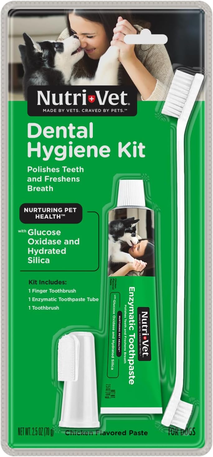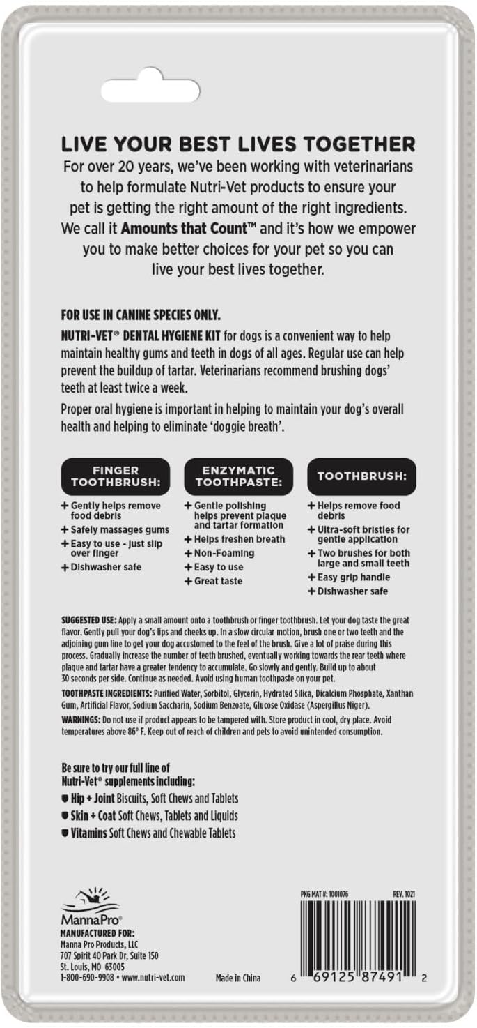 NUTRI-VET® DENTAL HYGIENE KIT for dogs is a convenient way to help maintain healthy gums and teeth in dogs of all ages. Regular use can help prevent the buildup of tartar. Veterinarians recommend brushing dogs’ teeth at least twice a week.