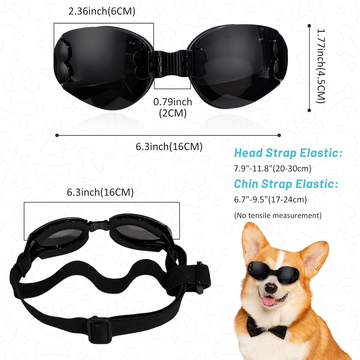 - Dog sunglasses length: 6.3 inches, Adjustable headband length: 7 inches -12 inches, Adjustable chin strap width: 5 inches -9 inches. Adjustable elastic band, easy to wear and light weight.