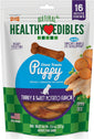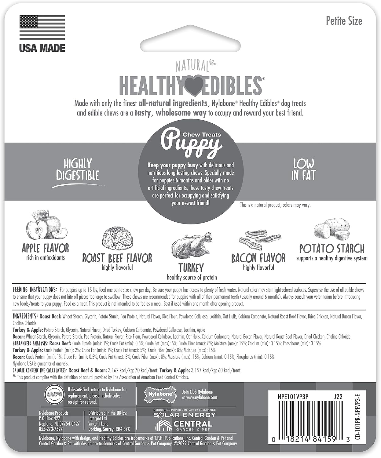 ABOUT HEALTHY EDIBLES Reward and occupy your best friend with Healthy Edibles dog treats! Made with no artificial colors, flavors, or preservatives, these natural dog treats come in many delicious flavors, engaging shapes, and sizes for every dog—even puppies! THREE DIFFERENT FLAVORS TO SATISFY YOUR PUPPY Specially made for puppies, this variety pack comes with 3 puppy treats in delicious flavors: bacon, roast beef, and turkey & apple. Each of these long-lasting puppy chews are highly digestible and made with the finest natural ingredients for a nutritious and yummy reward! GUARANTEED YOUR DOG WILL LOVE IT Before we introduce new dog products to furry friends and pet parents everywhere, we make sure our very own dogs love them first! If you’re not happy with your Nylabone chew treat for any reason, simply return it to us with the sales receipt for your money back. Or, reach out to our Consumer Care team so we can help make it right (and talk about how much we also love our dogs). MEET NYLABONE Ever since introducing our very first chew toy in 1955, Nylabone has been helping pet parents take the best possible care of their furry friends. Fast-forward 60+ years and our family-founded company is still trusted for tasty treats, high-quality chew toys, fun play toys, and easy-to-use dental products!