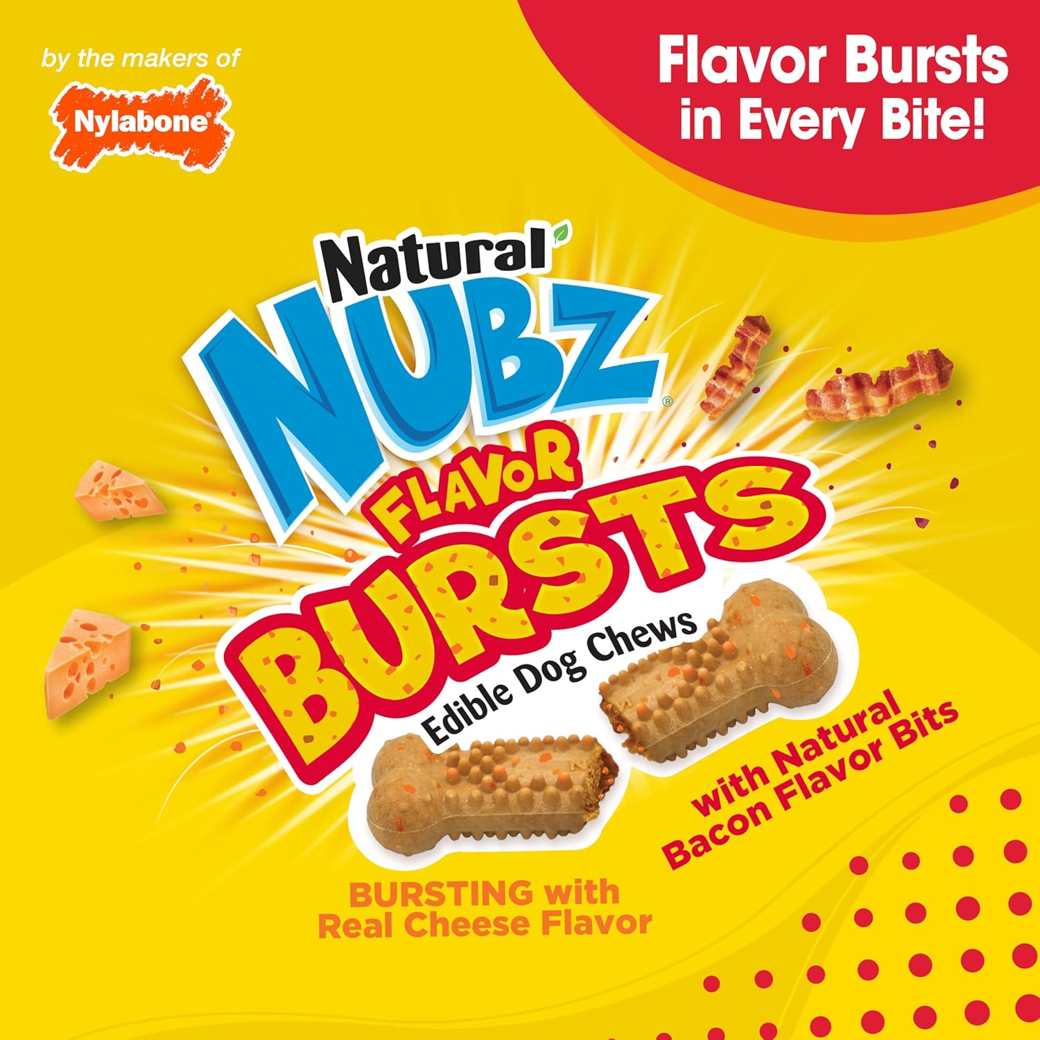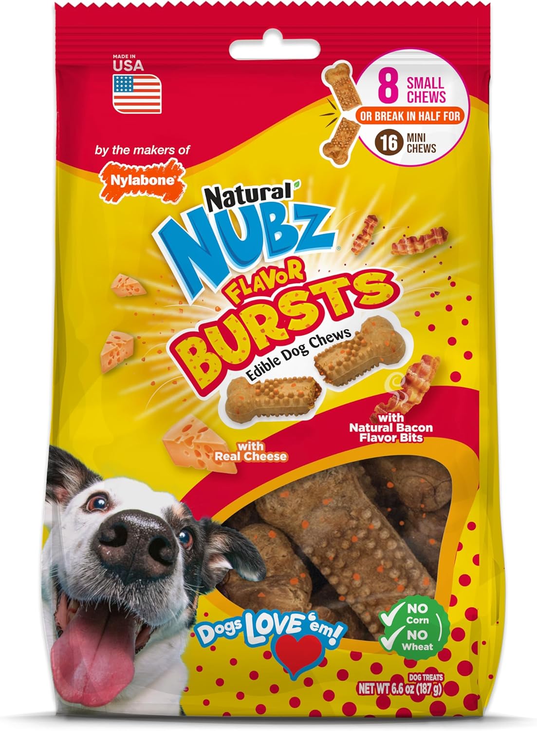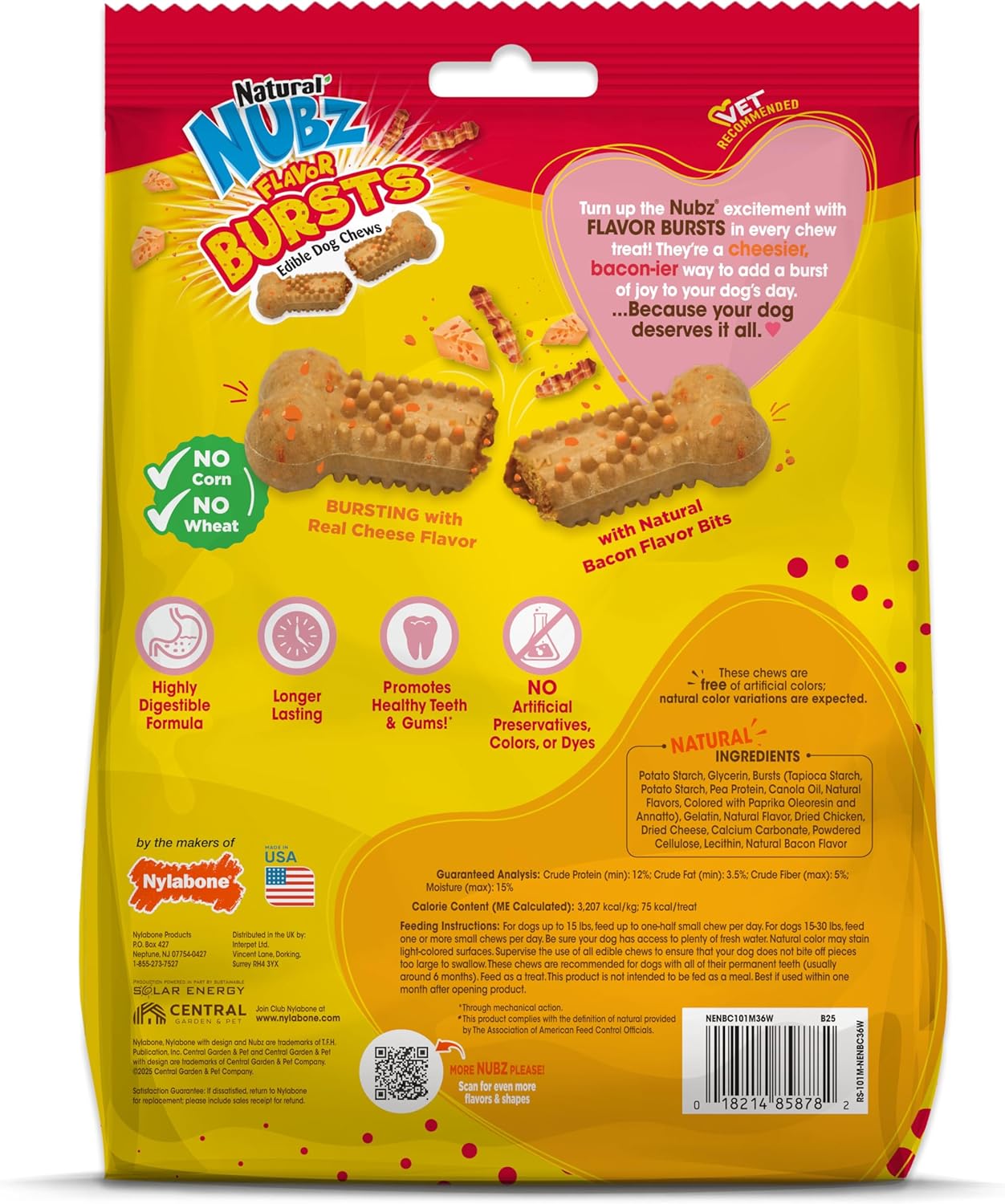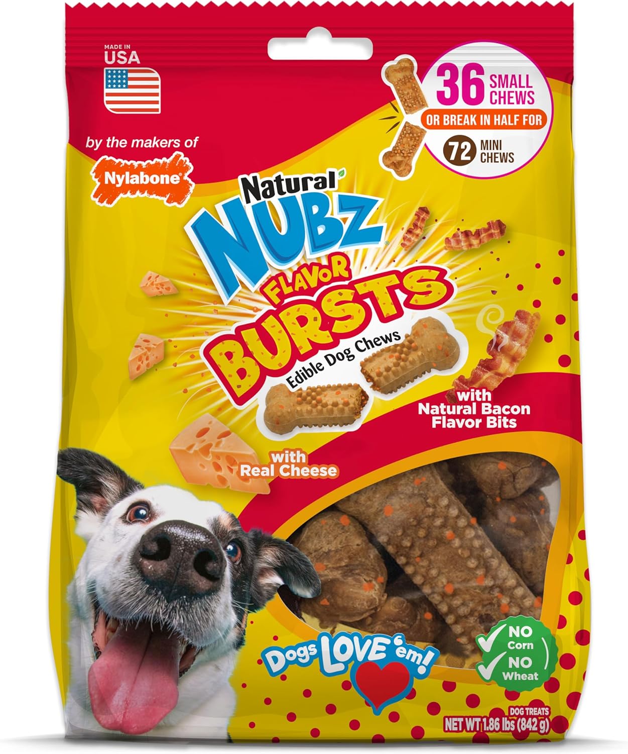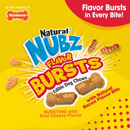 ABOUT NATURAL NUBZ Go for the good stuff! Natural Nubz dog treats give your dog the tastiness they crave and the wholesome goodness you love to give! These limited-ingredient treats are longer lasting for dogs and puppies who love to chew, and they’re easy to break in half for smaller treats. With a variety of irresistible flavors, enticing shapes, and engaging textures, these USA-made natural dog treats will keep your furry friend happy AND healthy…because your dog deserves it all! DOG CHEW TREATS BURSTING WITH REAL CHEESE & NATURAL BACON FLAVOR Turn up the treat time excitement! Nubz Flavor Bursts are a cheesier, bacon-ier way to add a burst of joy to your dog's day. Our special edible dog bone recipe gives your dog an explosion of cheesy, bacon goodness in every bite! Plus, these highly digestible dog treats for small dogs feature a grain-free, corn-free formula, and they're made with limited ingredients—no artificial colors, flavors, or preservatives. Talk about going for the good stuff! MEET NYLABONE Ever since introducing our very first chew toy in 1955, Nylabone has been helping pet parents take the best possible care of their furry friends. Fast-forward 60+ years and our family-founded company is still trusted for tasty treats, high-quality chew toys, fun play toys, and easy-to-use dental products! GUARANTEED YOUR DOG WILL LOVE IT Before we introduce new dog products to furry friends and pet parents everywhere, we make sure our very own dogs love them first! If you’re not happy with your Nylabone chew treat for any reason, simply return it to us with the sales receipt for your money back. Or, reach out to our Consumer Care team so we can help make it right (and talk about how much we also love our dogs).