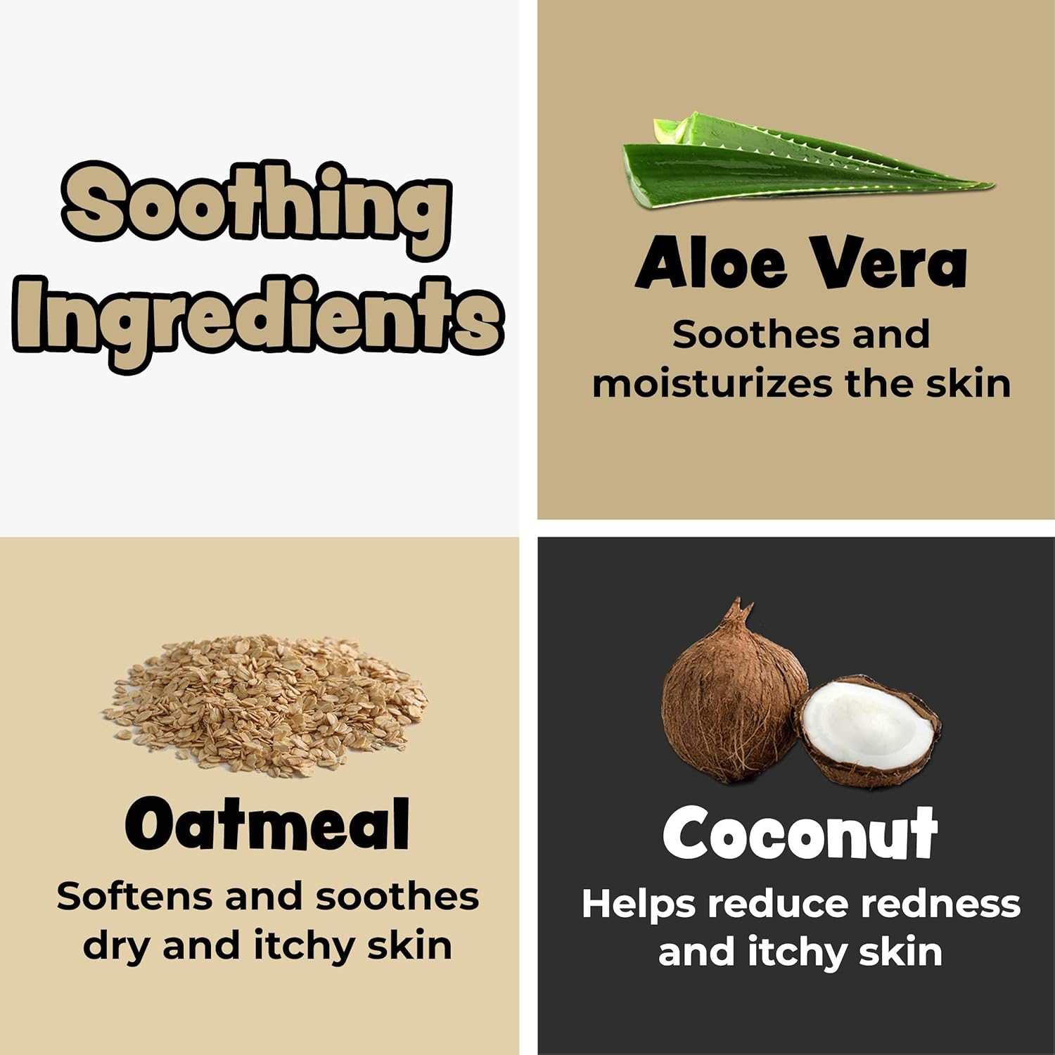 - Our pet shampoo for dogs contains oatmeal, which helps soften and moisturize itchy, dry, and irritated skin due to allergies, while Aloe Vera helps soothe and calm itchy and red skin.