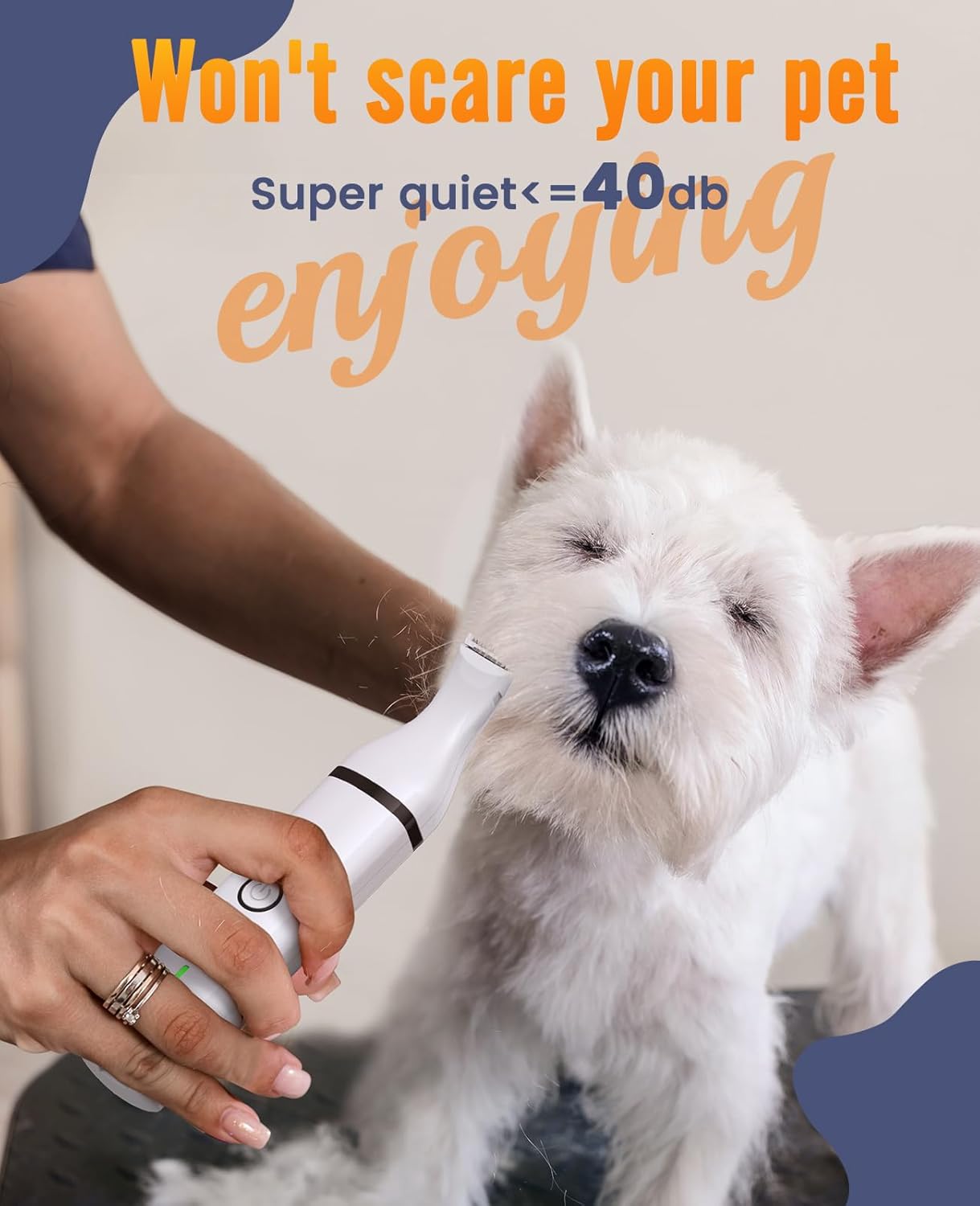 - [Quiet and Low Vibration Design for Stress-Free Grooming]: No more scared pups! This dog trimmer for grooming operates at below 40dB—gentle enough to keep your dog calm and relaxed. The low-vibration motor minimizes discomfort, making it ideal for anxious pets. Whether trimming paws, ears, rump, or face, your furry friend will stay peaceful throughout the session.