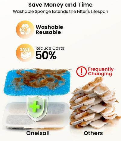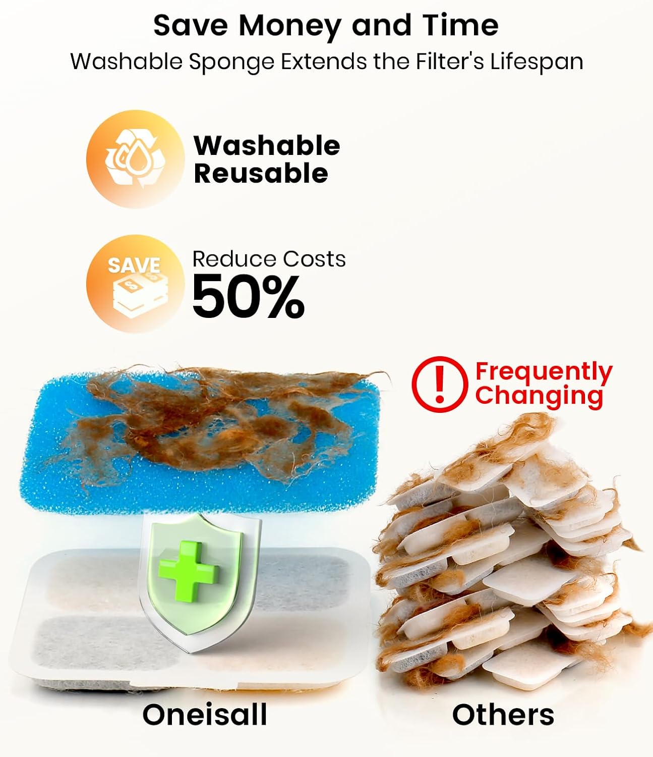- [Reusable and washable sponge + 5-Stage Filtration]: The pre-filter sponge first captures debris and hair, keeping the filter clean. Its washable design reduces the frequency and cost of filter cartridge replacement. Additionally, the five-layer filtered dog water fountain ensures fresher water for your pet by removing odors