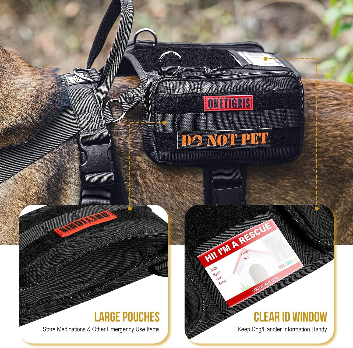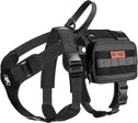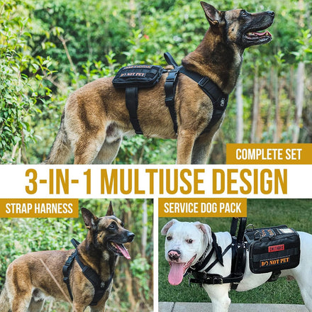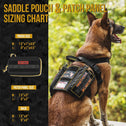 - Comes with an ergonomic strapped harness, saddled canine EDC pouches, with leash clips, MOLLE compatibility, patch panels, clear ID window, and service dog handle attachment D-rings.