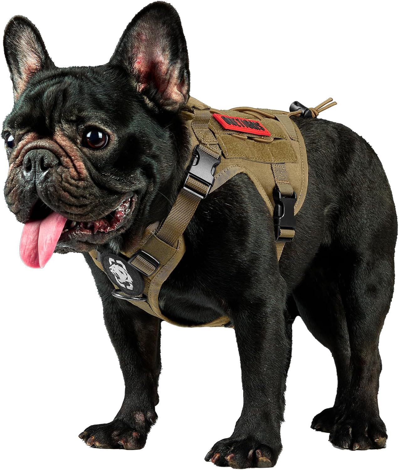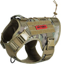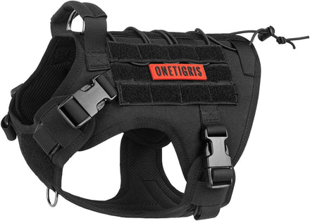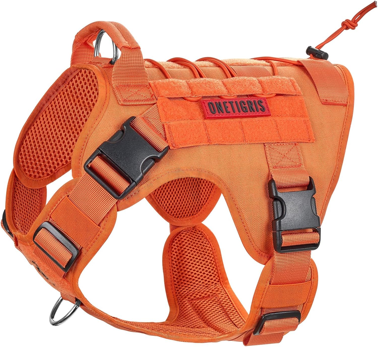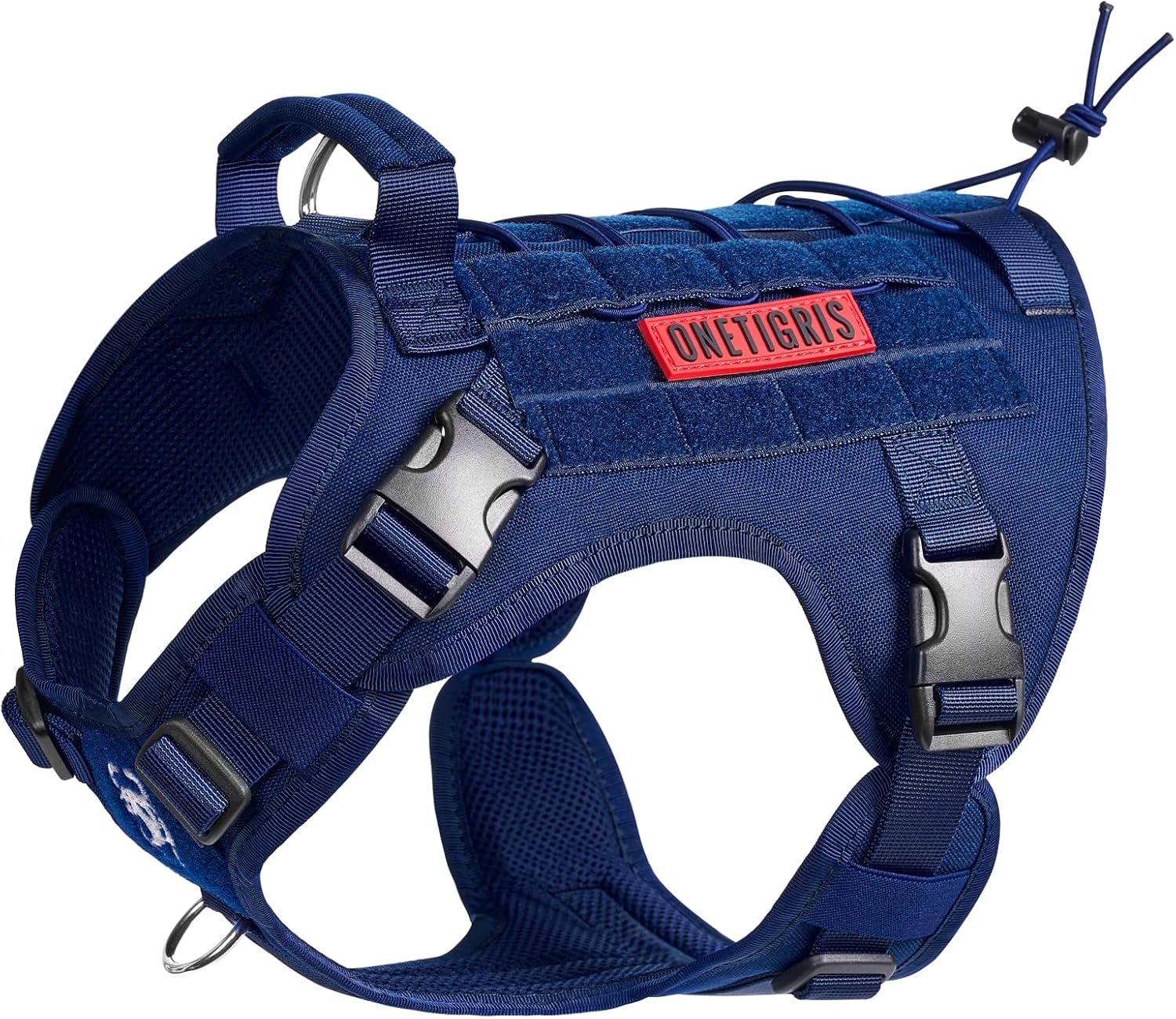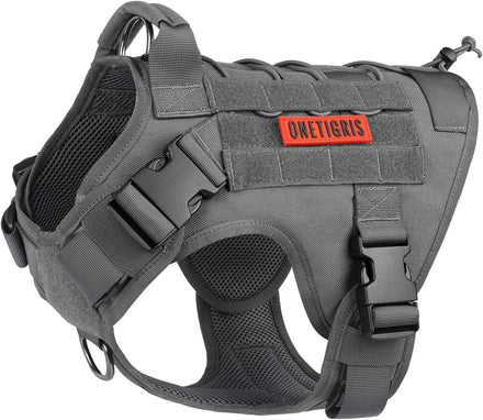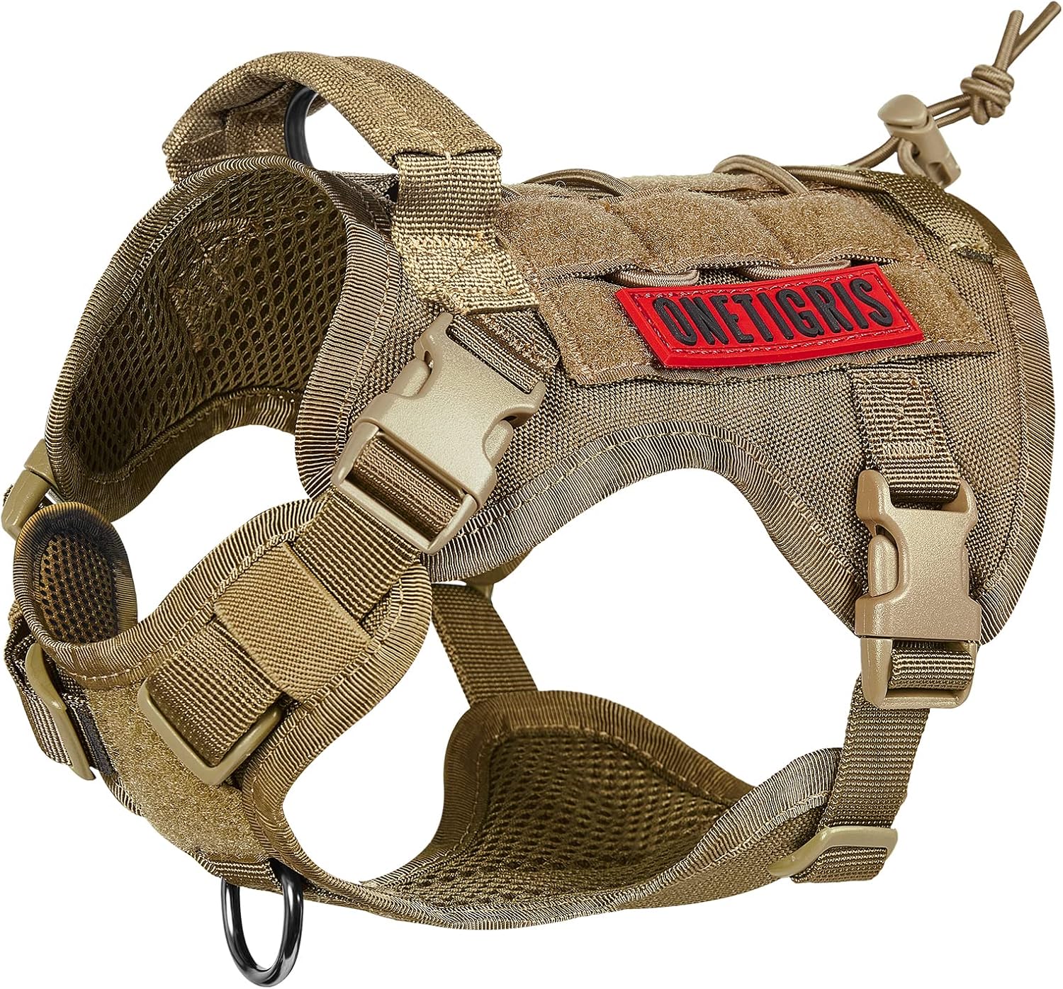 - MOLLE System & Military Style: Each side features two MOLLE straps as well as hoop & loop strips panel to easily attach molle pouches or ID panels; OneTigris harness is not designed to bear heavy weights and we advise against relying solely on the grab handle to carry your dog
