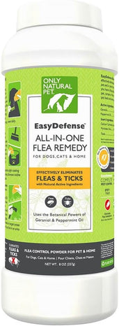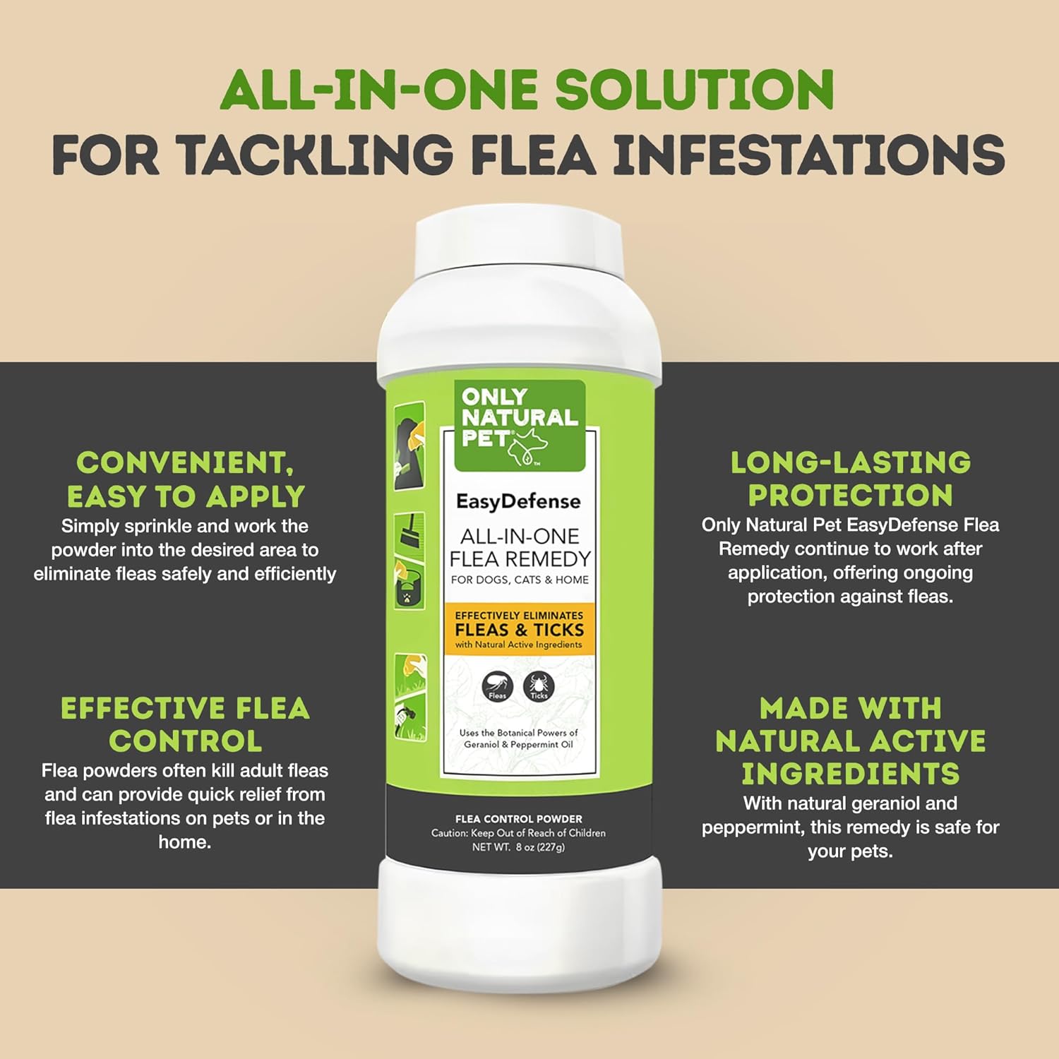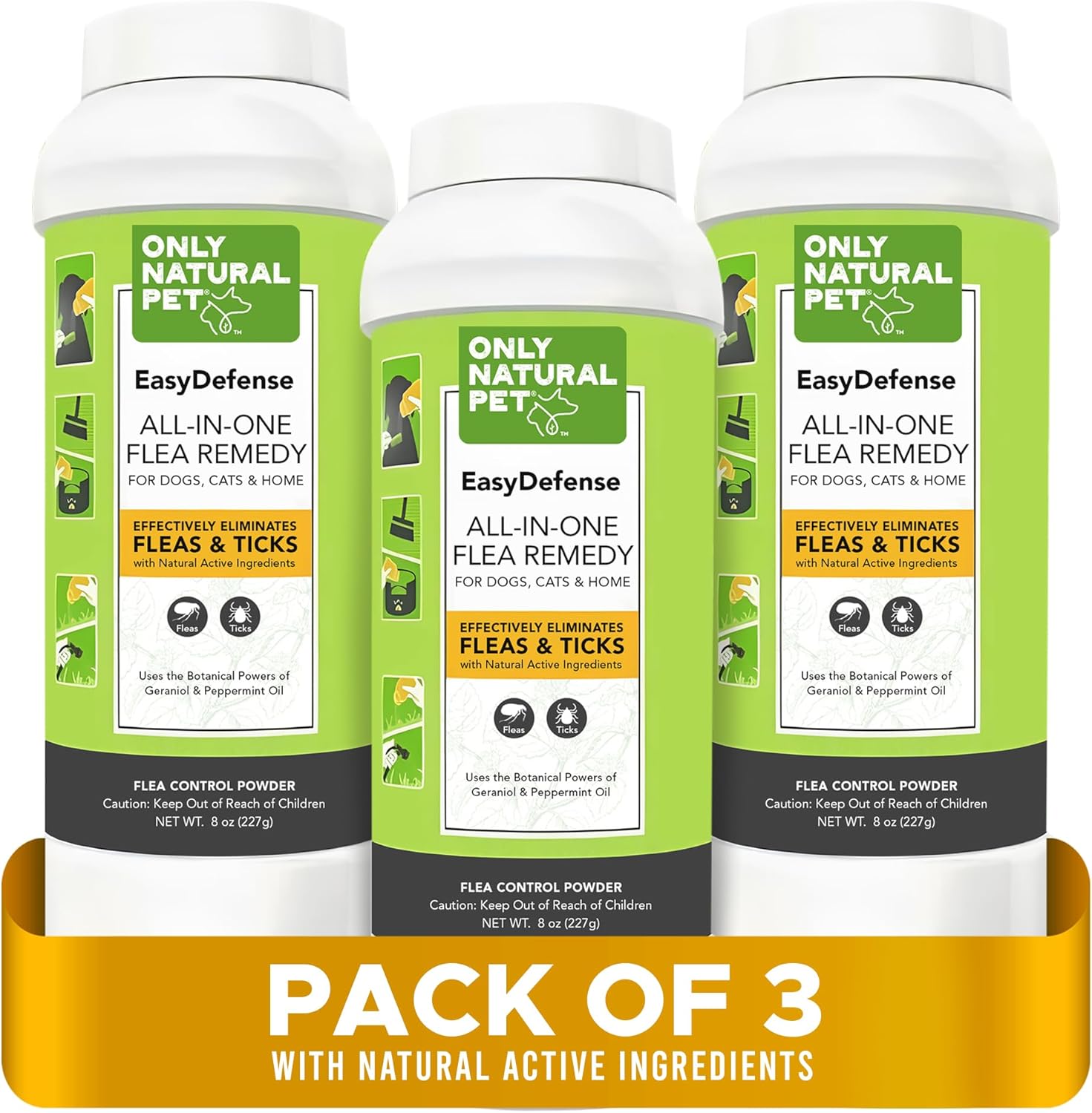 ONLY NATURAL PET EasyDefense All-in-One Flea Remedy Powder offers a plant-based solution to repel fleas and ticks naturally. Made with geraniol and peppermint, this gentle yet efficacious powder is safe for dogs and cats when used as directed. Designed for multi-surface use, it protects your home, furniture, and pet bedding while addressing flea infestations at all life stages. The convenient 3-pack ensures long-lasting coverage for a healthier, pest-free environment.