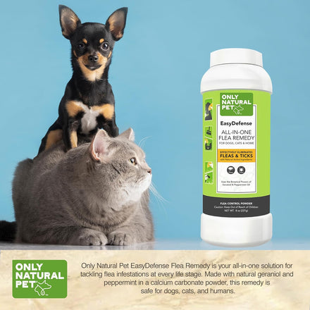 Elevate your pet care routine with ONLY NATURAL PET EasyDefense All-in-One Flea Remedy Powder, crafted for multi-surface application. This plant-based formula, featuring natural geraniol and peppermint, safeguards your pets and home. Ideal for furniture, carpets, bedding, and outdoor spaces, the powder efficiently repels fleas and ticks, offering pet owners peace of mind.