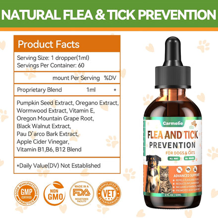 - Natural Oral Flea & Tick Support for Dogs & Cats: Looking for a natural way to help protect your pets from fleas & ticks? Carmelie’s oral flea & tick drops provide an easy, plant-based solution for dogs and cats. Formulated with natural extracts, these daily drops help discourage fleas, ticks, eggs, larvae, and mosquitoes while supporting your pet’s skin health and overall wellness—so they can enjoy a more comfortable life.
