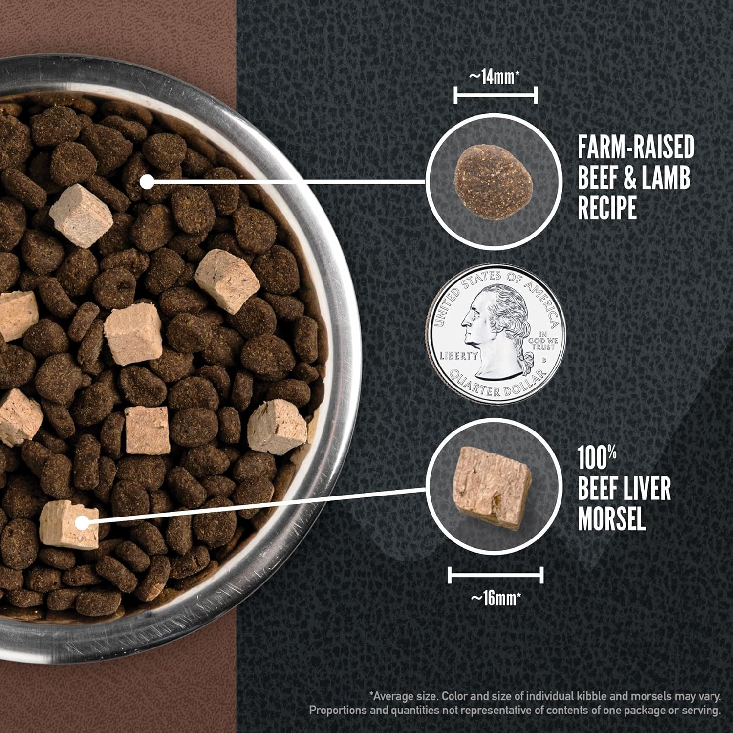 Make every meal enjoyable for your dog with dry dog food full of ingredients that help them thrive in ORIJEN WILD RESERVE Farm-Raised Beef & Lamb recipe. The first 5 ingredients* in this protein-packed kibble are fresh or raw meat and it is elevated with 100% beef liver morsels, freeze-dried to preserve flavor and nutrition for your dog. These freeze-dried beef liver inclusions add flavor to every bite, introduce variety and texture, and help provide excitement at mealtime. This ORIJEN Biologically Appropriate dry dog food recipe features nutrient-dense WholePrey animal ingredients and helps support your dog’s Immune System, Skin and Coat, and Digestive Health. Nourish your dog completely with ORIJEN WILD RESERVE premium dog food. *Derived from the unprocessed state of the ingredients. Our included fresh ingredients are delivered refrigerated and our included raw ingredients are delivered frozen.