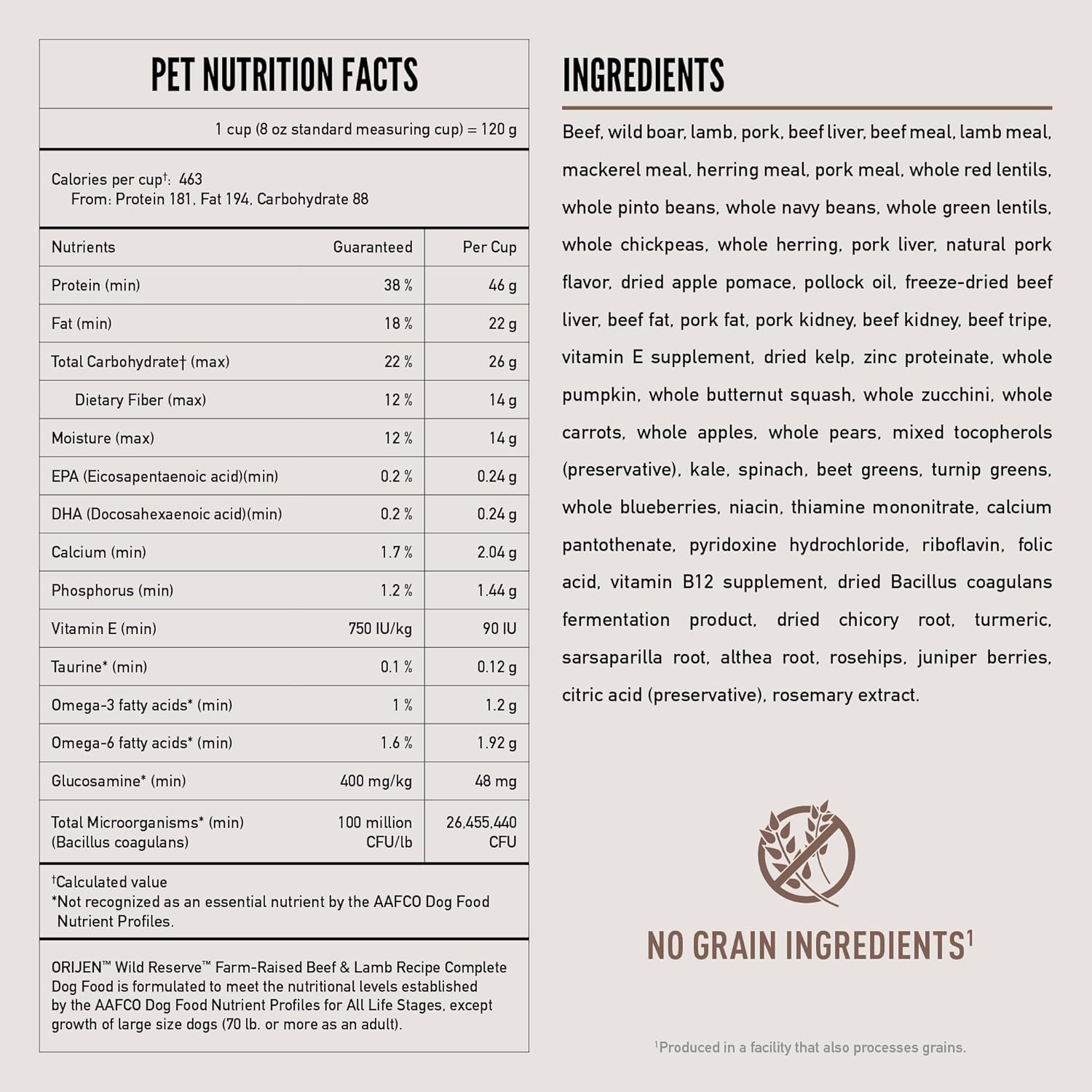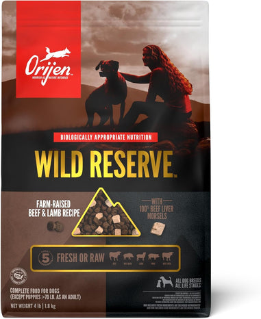 - One (1) 4lb bag of ORIJEN WILD RESERVE Dry Dog Food – Farm-Raised Beef & Lamb recipe