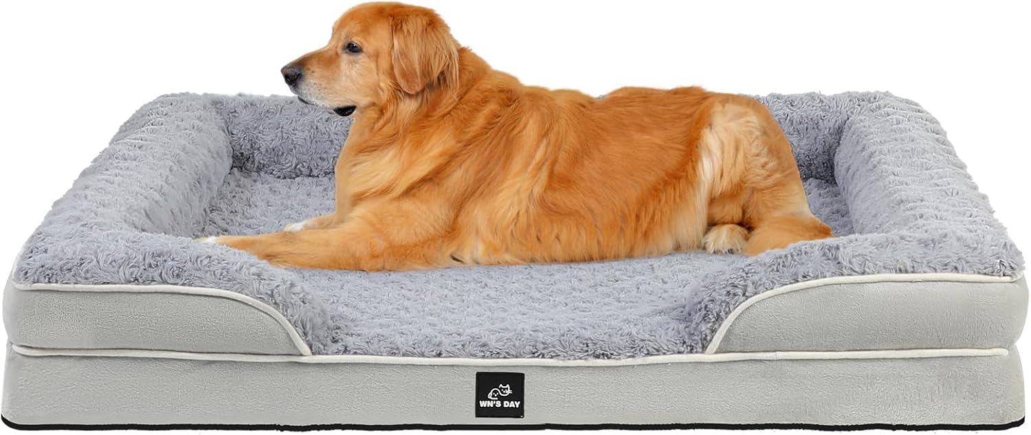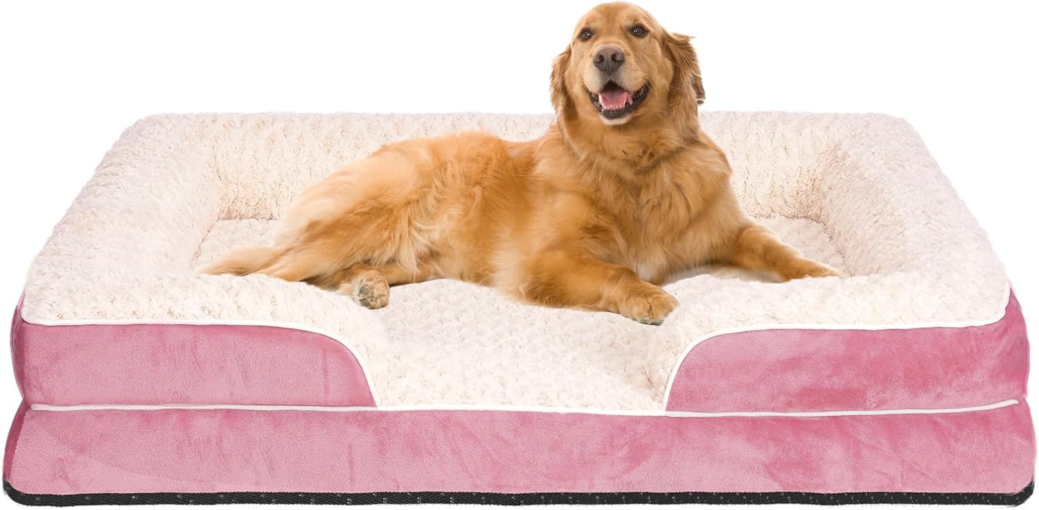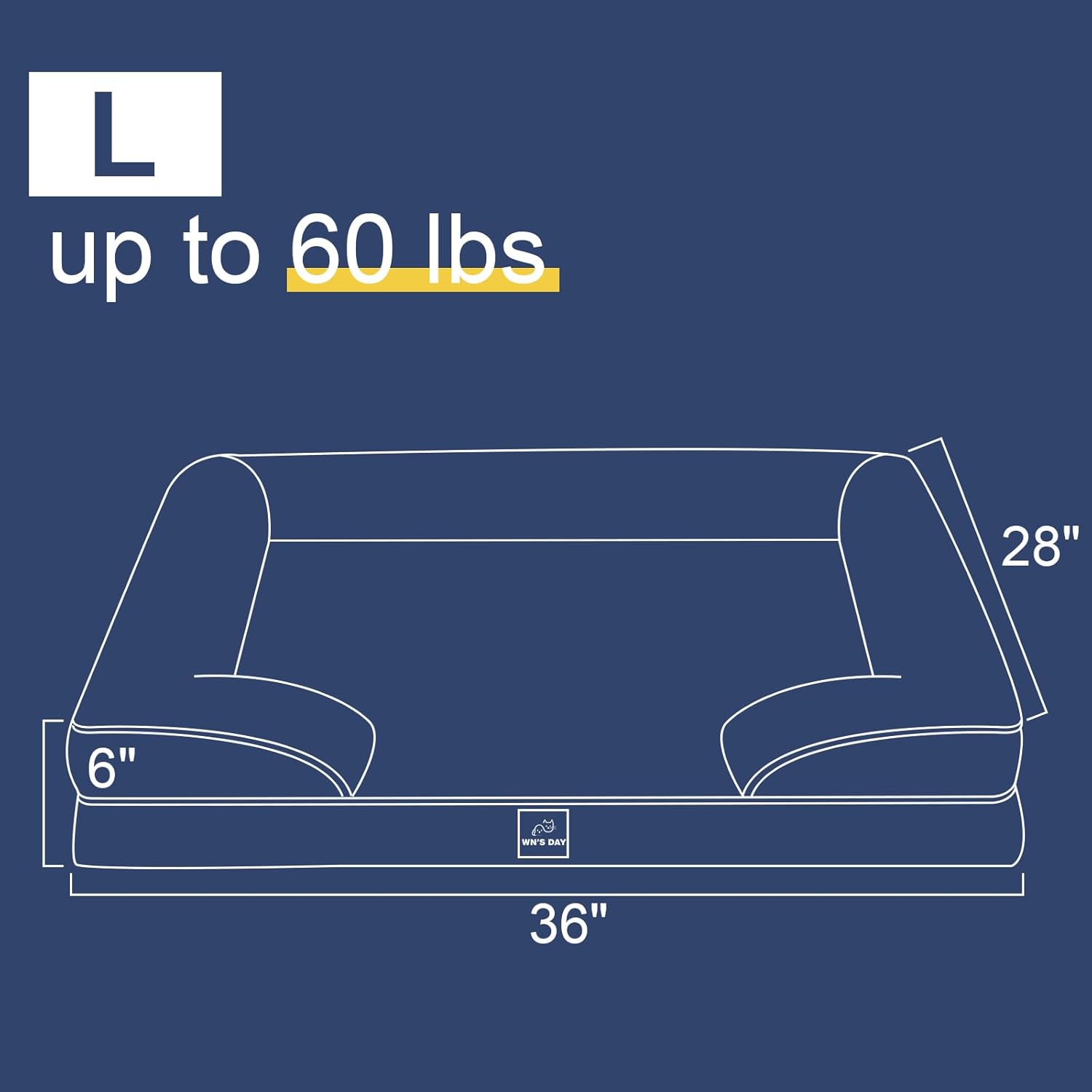 Do you know how many hours do dogs sleep a day? On average, adult dogs sleep around 12-14 hours a day. Puppies and senior dogs may sleep even more, sometimes up to 18 hours a day. Good sleep helps a dog's brain development, memory, and learning capacity, as well as its immune system. So, why not choose a comfortable bed for your pet? Why choose us? Orthopedic Dog Bed: High-density egg crate foam can provide good support for pets and relieve joint pressure. Ring Pillow Design: The ring pillows on all four sides allow pets to snuggle better in the large dog bed and provide a sense of security for pets Rose Velvet Fabric: Delicate touch, soft and smooth, pet-friendly Waterproof And Anti-slip: The waterproof design can prevent liquid from penetrating into the dog beds xlarge sized dog, and the anti-slip design can make pets more comfortable when using the dog couch bed Easy to clean: Just unzip and remove the inner foam to clean the bed cover, which can be machine-washed. After-sales service: You can contact us with any questions, and we will help you solve them in time Size recommendation: L: 36*28*6 in, suitable for dogs under 60lbs XL: 42 x 31 x 7 in, suitable for dogs under 100lbs XXL: 48 x 35 x 7.5, inches, suitable for dogs under 120lbs In order to give your pet a comfortable orthopedic dog bed, please do not hesitate, our dog beds will meet all your needs.