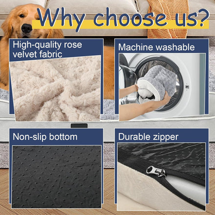 - 【Rose Velvet Fabric】The special feature of this big dog bed is the rose velvet fabric on its surface. Compared with ordinary fabrics, rose velvet fabric has a more delicate touch, and it feels like stroking swan feathers. Pets lying on it can effectively relieve anxiety. In addition, the fabric material is gentle and friendly for pets' noses and skin.