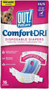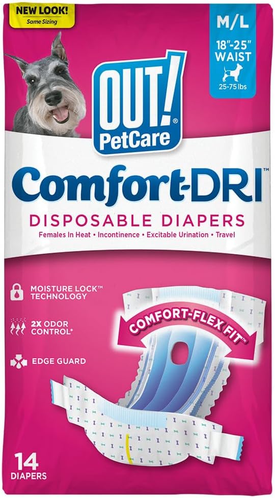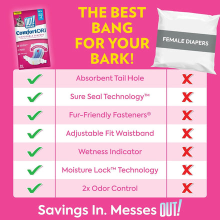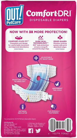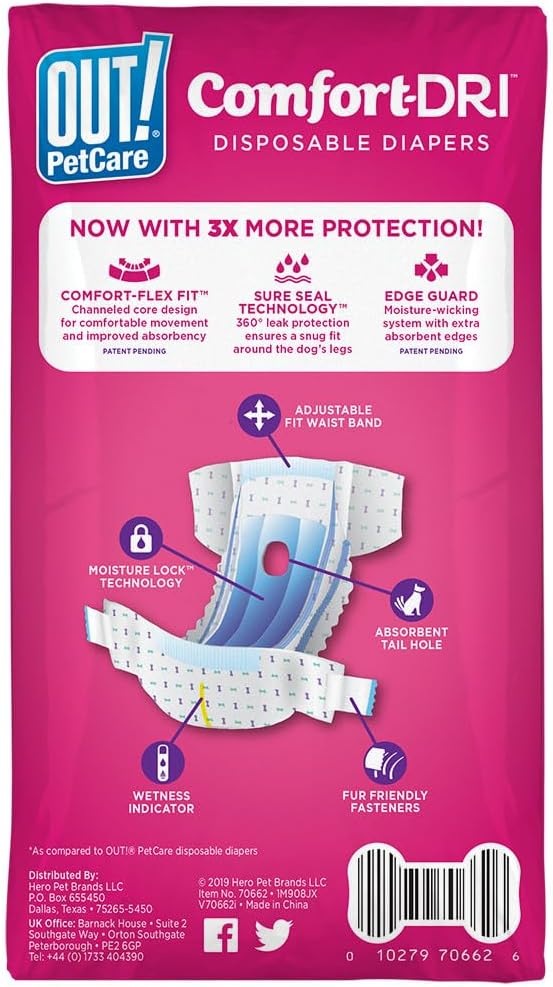Introducing OUT! Petcare Disposable Dog Diapers for Female Dogs, your solution to urinary incontinence, travel, excitable urination, or heat cycles. Specifically designed for small dogs with a 13- to 18-inch waist, these diapers offer a Comfort-Flex fit and a channeled core design for maximum comfort and movement. Featuring a super-absorbent core with moisture-locking technology and leak-proof edges, these diapers keep your home clean while a wetness indicator alerts you when it's time for a change. With fur-friendly, repositionable fasteners and odor-neutralizing properties, these diapers ensure both your pup and your home stay fresh. Trust OUT! Petcare for safe, affordable, and dependable pet care solutions.