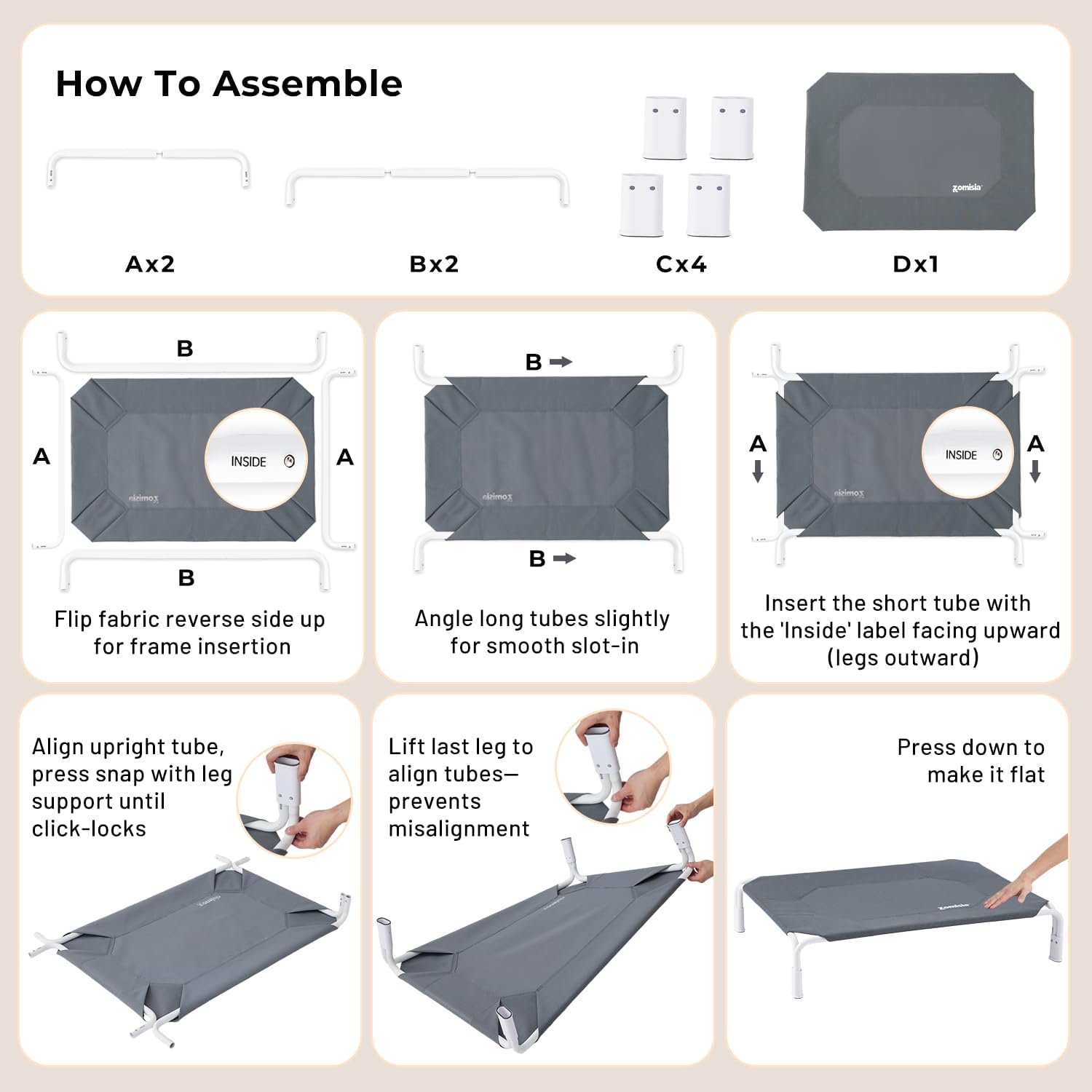 - Tool-Free Assembly in Minutes: No tools needed! Our elevated dog bed assembles effortlessly in minutes. Elastic connecting wires and snap fasteners between steel tubes make setup or takedown a breeze for busy pet parents.