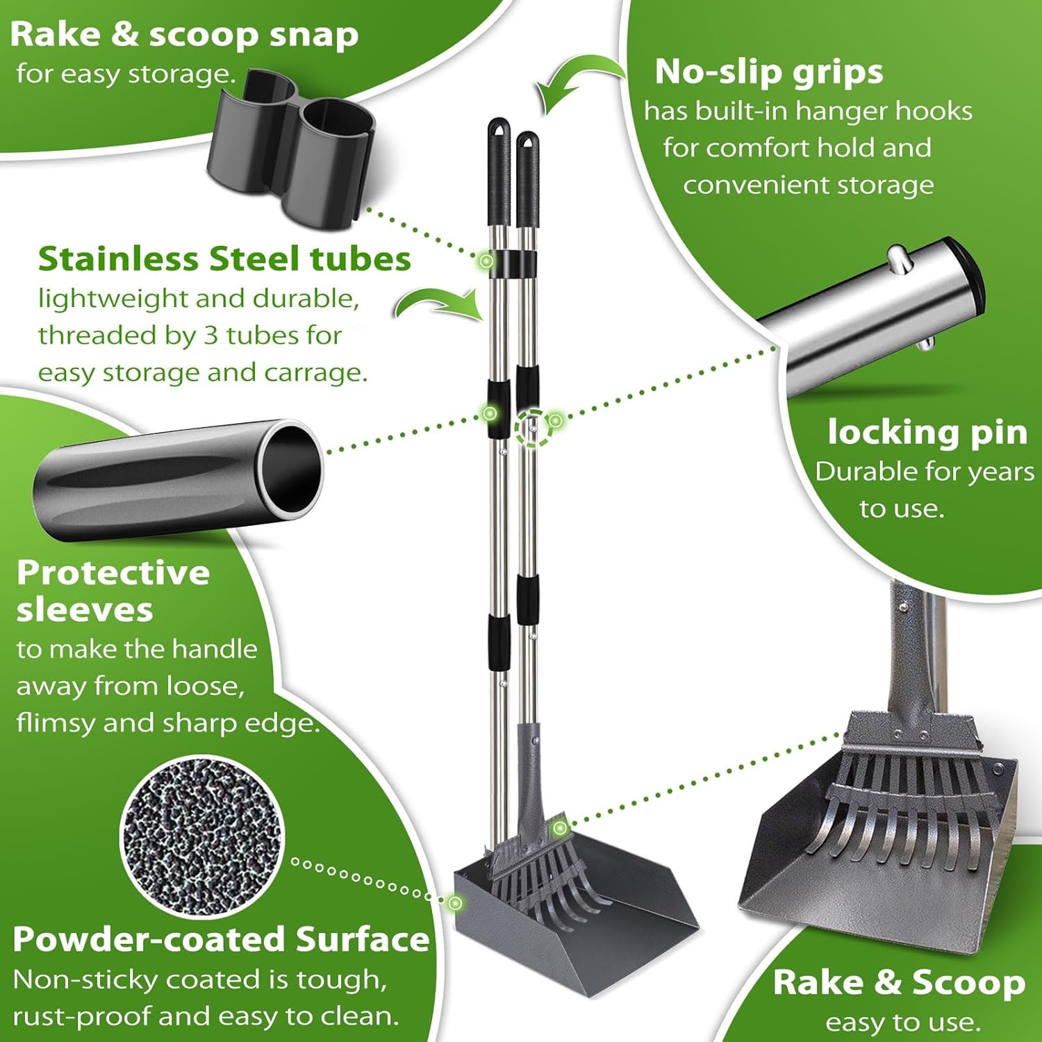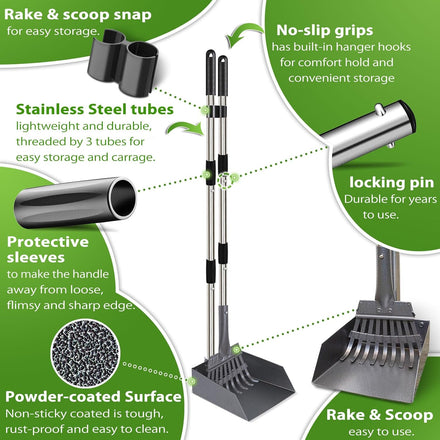 The 37,4 inch long handle offers a comfortable position to easily scoop up your dogs poop without ever having to stretch, kneel, or bend down, keeping you away from all mess and smell. The flexible rake is perfect for picking up pet waste on a variety of surfaces like grass, dirt, gravel, and rocks.