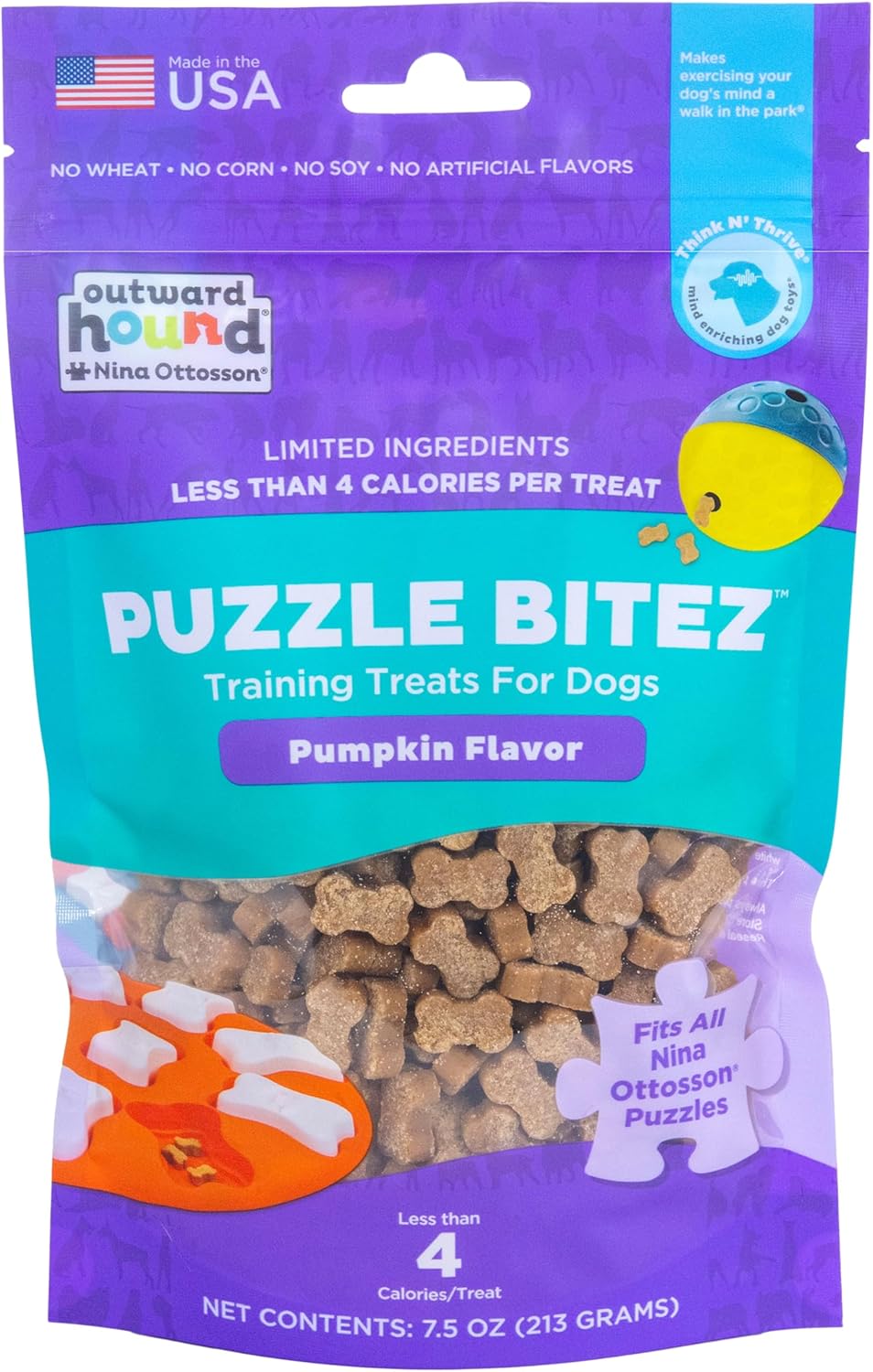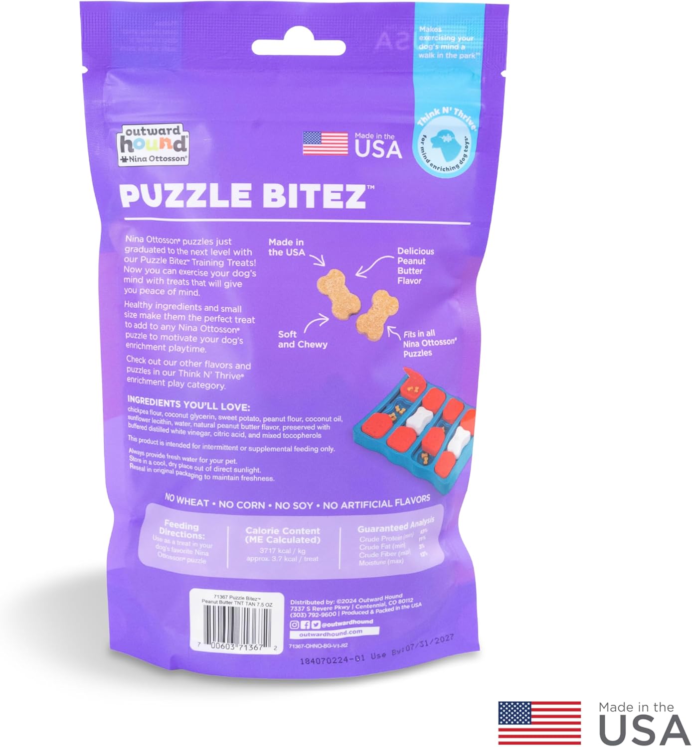 Nina Ottosson by Outward Hound Puzzle Bitez Training Treats for Dogs are all-natural dog treats free from artificial flavors, colors, and preservatives. Crafted from limited ingredients without corn, wheat, or soy and proudly made in the USA, these treats prioritize your dog's well-being. The perfect size for Nina Ottosson dog puzzles, these small dog treats become a delightful reward during mental enrichment games. The irresistible peanut butter flavor is a canine favorite, and these dog treats boast less than 4 calories per treat, with a generous 213 pieces per bag. The soft dog treat texture ensures swift consumption, minimizing chewing delays during training sessions. Prioritize your dog's tastebuds and make puzzle play all the more fun with Nina Ottosson by Outward Hound Puzzle Bitez. Always provide fresh water for your pet. Store in a cool, dry place out of direct sunlight. Re-seal in original packaging to maintain freshness. Please use within 30 days of opening.