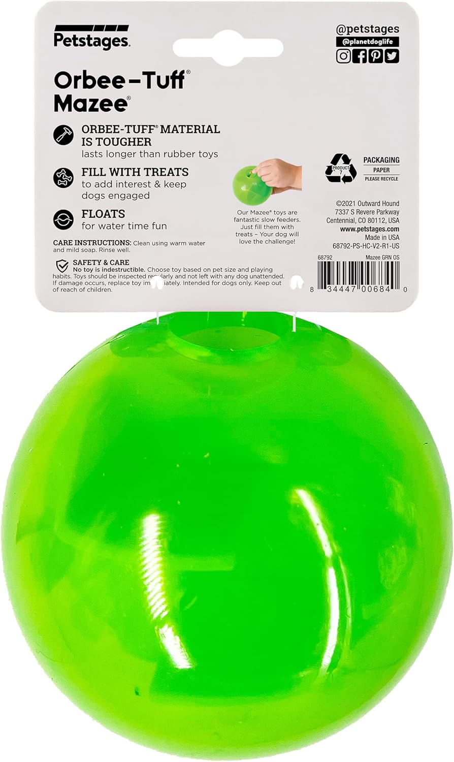 Planet Dog’s Orbee-Tuff Mazee is engaging, rewarding, and fun! This interactive dog puzzle toy is great for bored pups who need a dog enrichment toy that’s a rewarding brain teaser. It’s also a dog toy that encourages slower eating habits for fast eaters. The tinted and pliable Orbee-Tuff TPE shell design is combined with the plastic inner maze to entice all your dog’s senses. Cleaning is simple and fast. Just fill the ball with warm water and gentle soap, shake, rinse out, and air dry. This toy is intended for supervised fun and is not a chew toy or suitable for aggressive chewers. Clean using warm water and mild soap. Rinse well. SAFETY & CARE: No toy is indestructible. Choose toy based on pet size and playing habits. Toys should be inspected regularly and not left with any dog unattended. If damage occurs, replace toy immediately. Intended for dogs only. Keep out of reach of children.