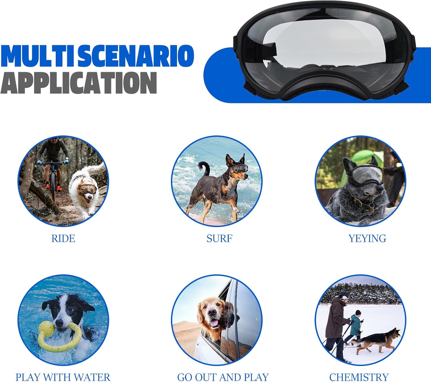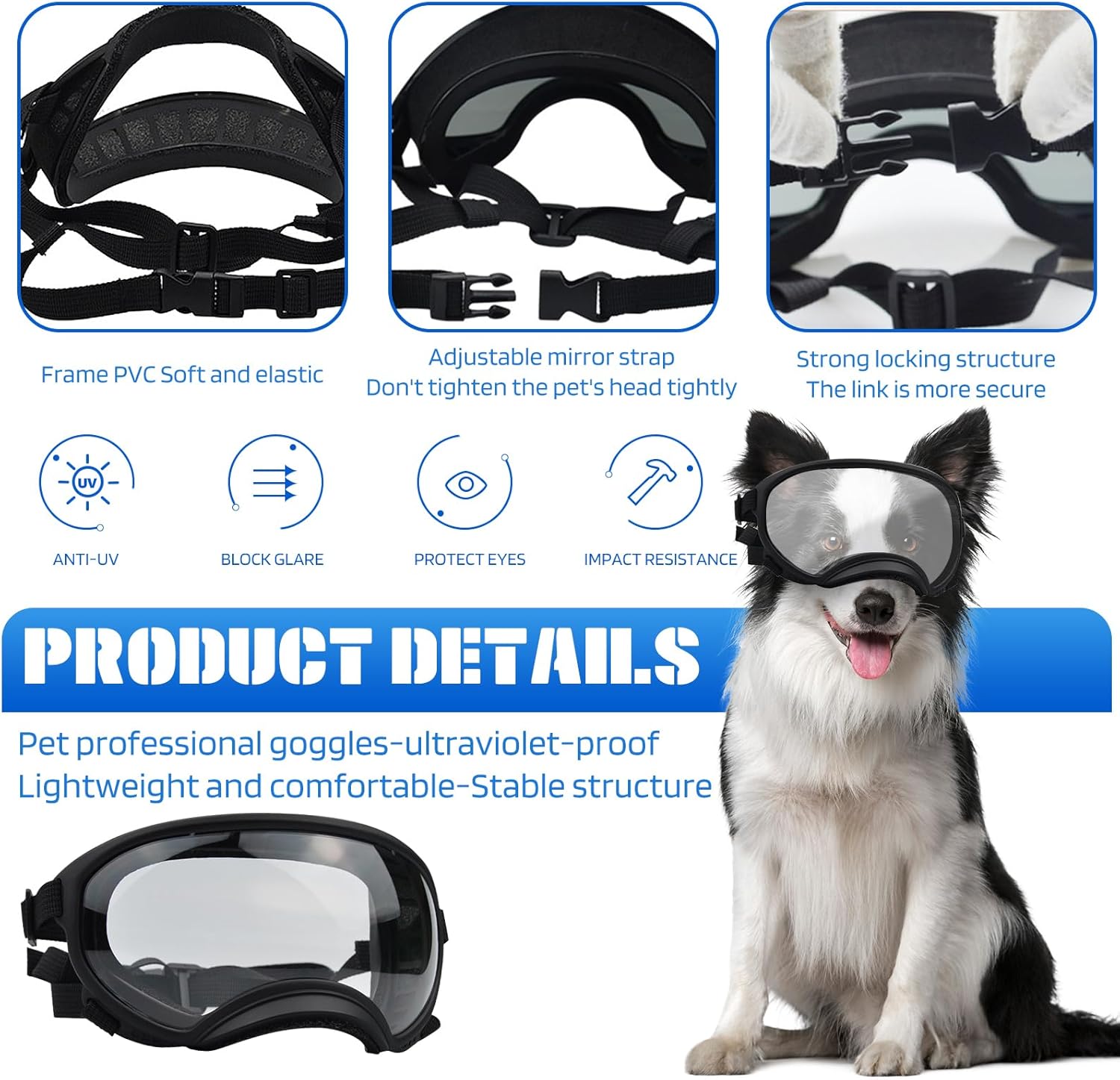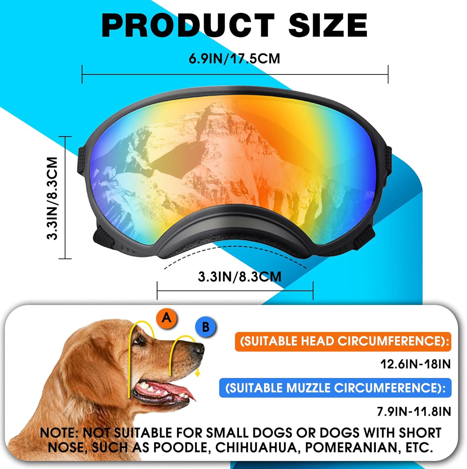 - Protección completa: las gafas para perros de raza mediana están hechas de lentes de policarbonato de alta calidad resistentes a los rayos UV, resistentes a los impactos e inastillables. Diseño transpirable que añade mayor comodidad. Gran diseño de espejo curvado diseñado para perros, se ajusta más a la nariz del perro, no se cae fácilmente y proporciona una mejor visión del perro. Cinturón ajustable y diseño de cierre de bloqueo fuerte, uso más seguro.