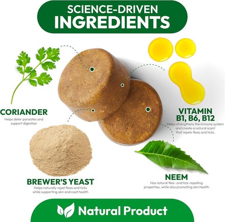 - Ingredientes naturales y seguros: fabricado con ingredientes naturales cuidadosamente seleccionados, nuestra prevención de pulgas y garrapatas para perros masticable ayuda a proteger la salud de tu perro sin productos químicos agresivos.