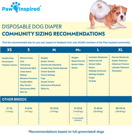 - - MEJOR PARA HEMBRA - perritas e incontinencia urinaria. Si mides a tu mascota correctamente y eliges el tamaño correspondiente, estos pañales se adaptarán a muchas razas de perros, incluidas formas corporales desafiantes como perros salchicha, yorkies, pug, bulldogs franceses, bulldogs, razas sin cola y muchos otros pañales para perros Houdinis. Si tu perro sigue siendo un pañal profesional para perros, puedes echar un vistazo a nuestros tirantes de pañales para perros Paw Inspired que asegurarán que tus pañales se mantengan puestos y se mantengan en su lugar.