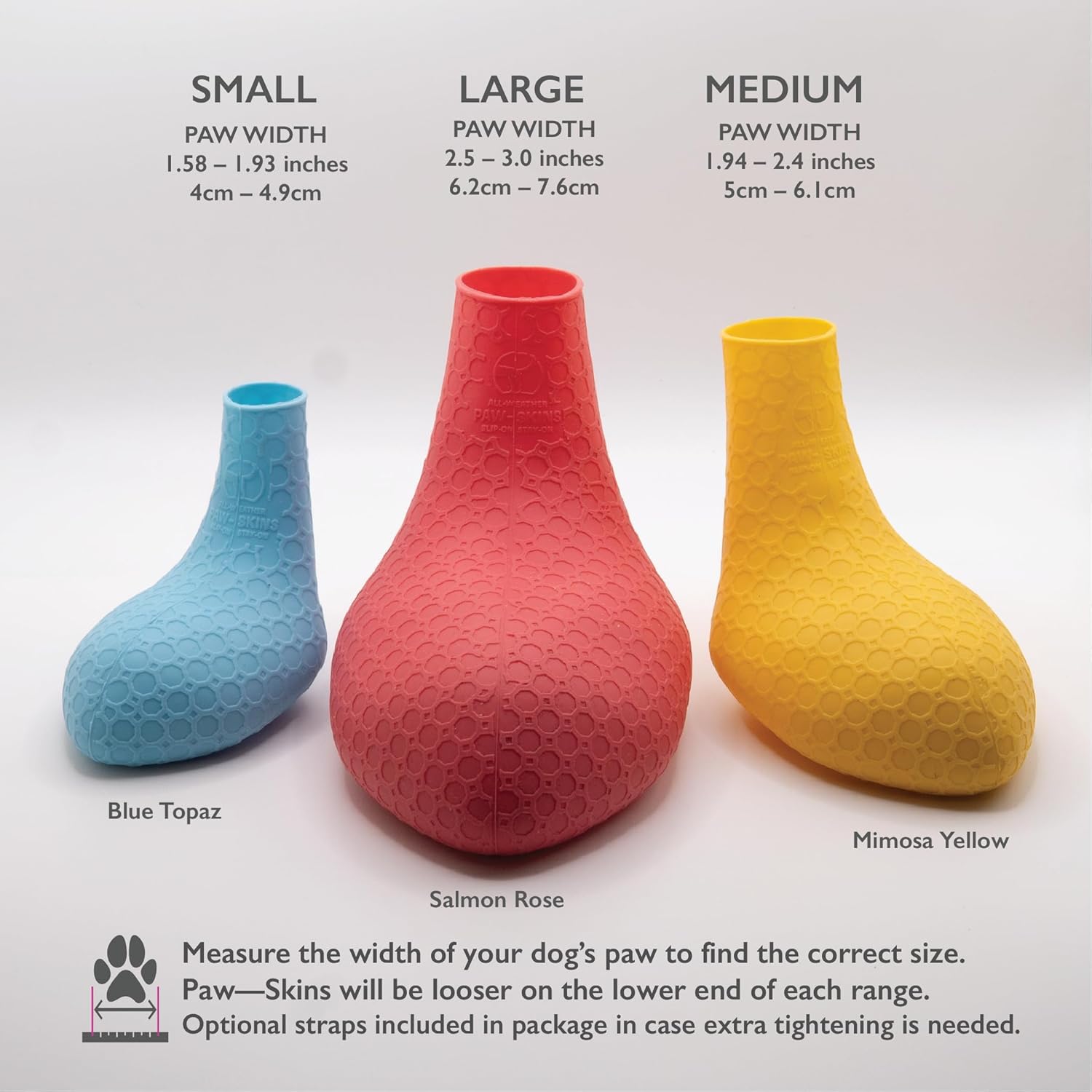 - Package includes 4 Paw—Skins and 4 velcro straps in case of loose fit or you're going on a demanding hike or playing high intensity games. Measure paw width with ruler before ordering these non-slip dog shoes that stay secure on every adventure.