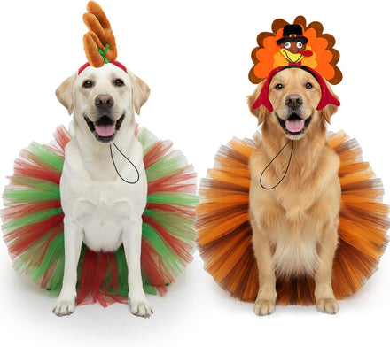PAWNISAW Thanksgiving & Christmas Dog Costume Set, Cute Turkey & Antler Headband & Dog Tutu Dress Holiday Party Outfit Accessories for Medium, Large Dogs