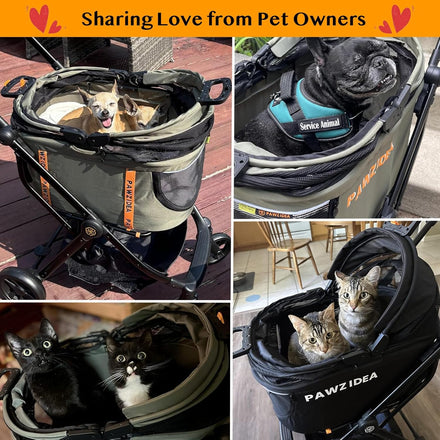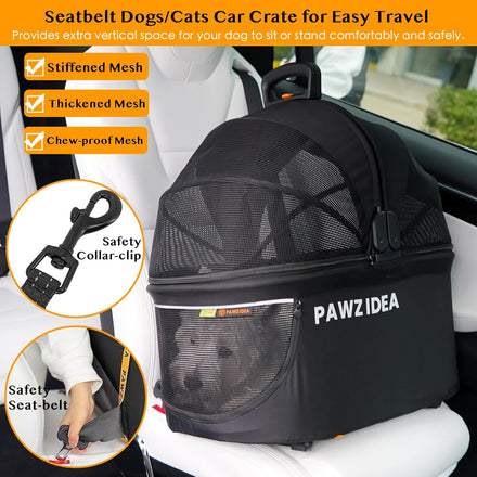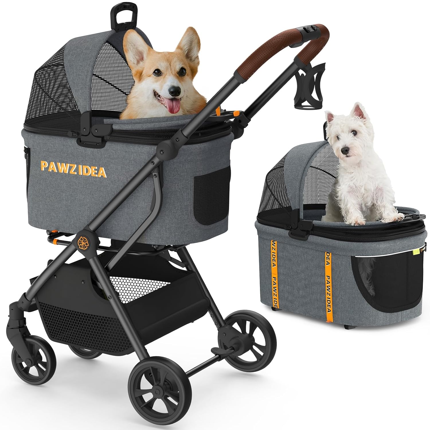 - 4-IN-1 Pet TRAVEL SYSTEM -Pet Stroller + Detachable Travel Carrier + Seatbelt Dogs Booster Car Seat Combo + Dogs/Cats House. Removable and washable canopy and seat cushion. Pet stroller with removable carrier with a larger easy-open zipper door allows your fur-kids to get on and off the puppy stroller freely.