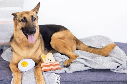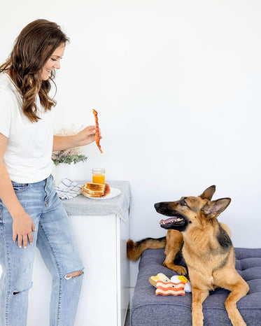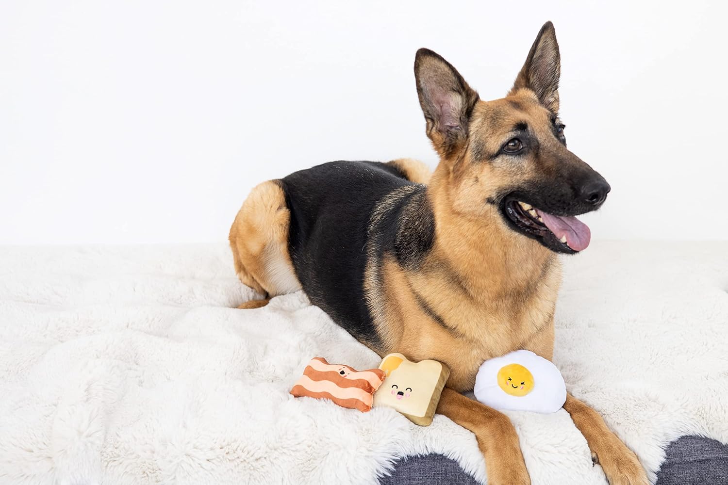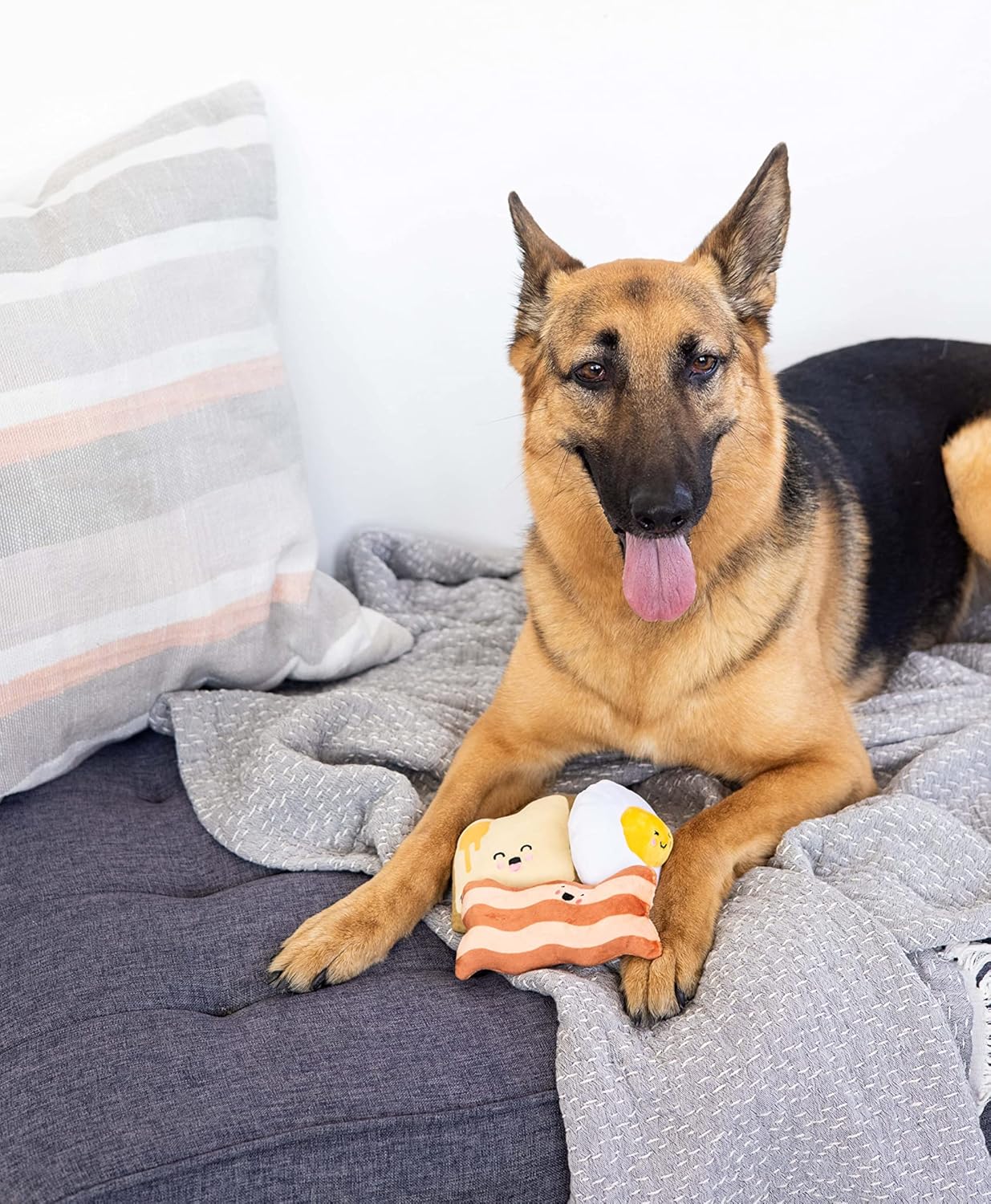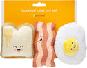 - Includes three plush toys: a fried egg with a squeaker and crinkle paper, buttery toast with a squeaker, and sizzling bacon that crinkles