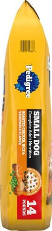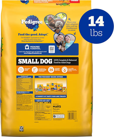 - Contains one (1) 14 lb. Bag of Pedigree Complete Nutrition Adult Small Dog Dry Dog Food, Roasted Chicken, Rice & Vegetable Flavor.