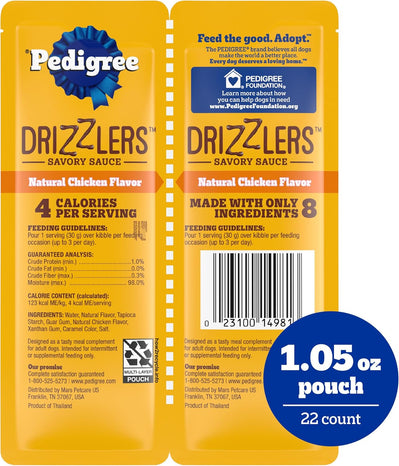 - Only 4 Calories Per Serving: Pedigree Drizzlers Savory Sauce is only 4 calories per serving. This wet dog meal complement also has only 8 ingredients