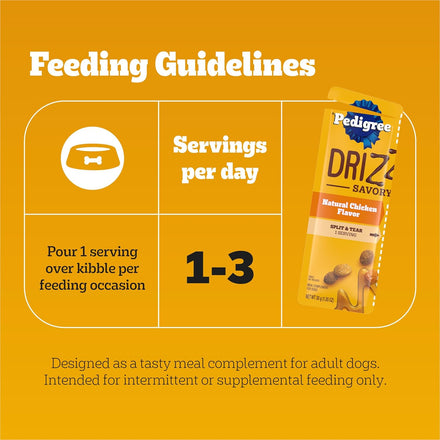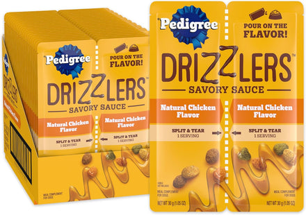 - Pour on the Flavor: Coat Pedigree Drizzlers Savory Sauce over your dog’s dry kibble and watch the flavor pour in the bowl while maintaining the kibble's crunchiness