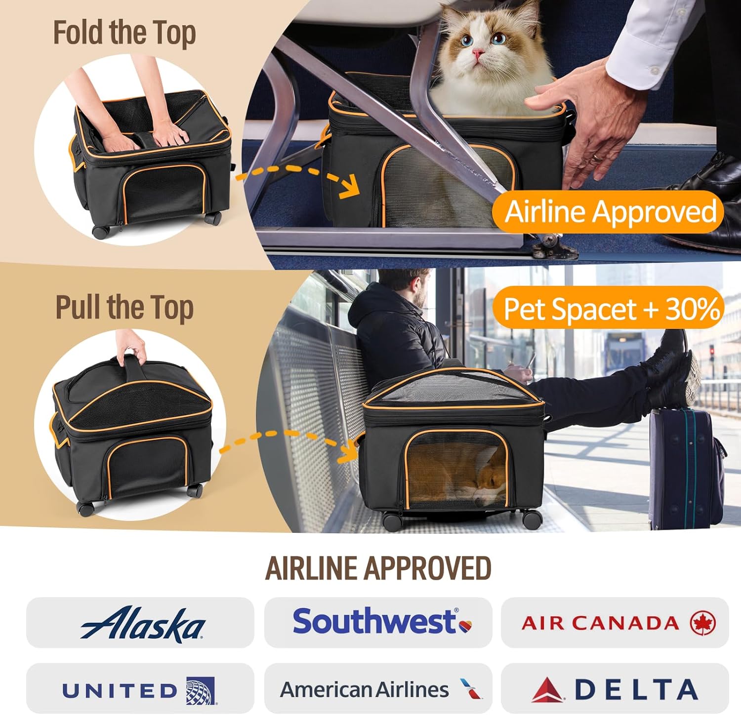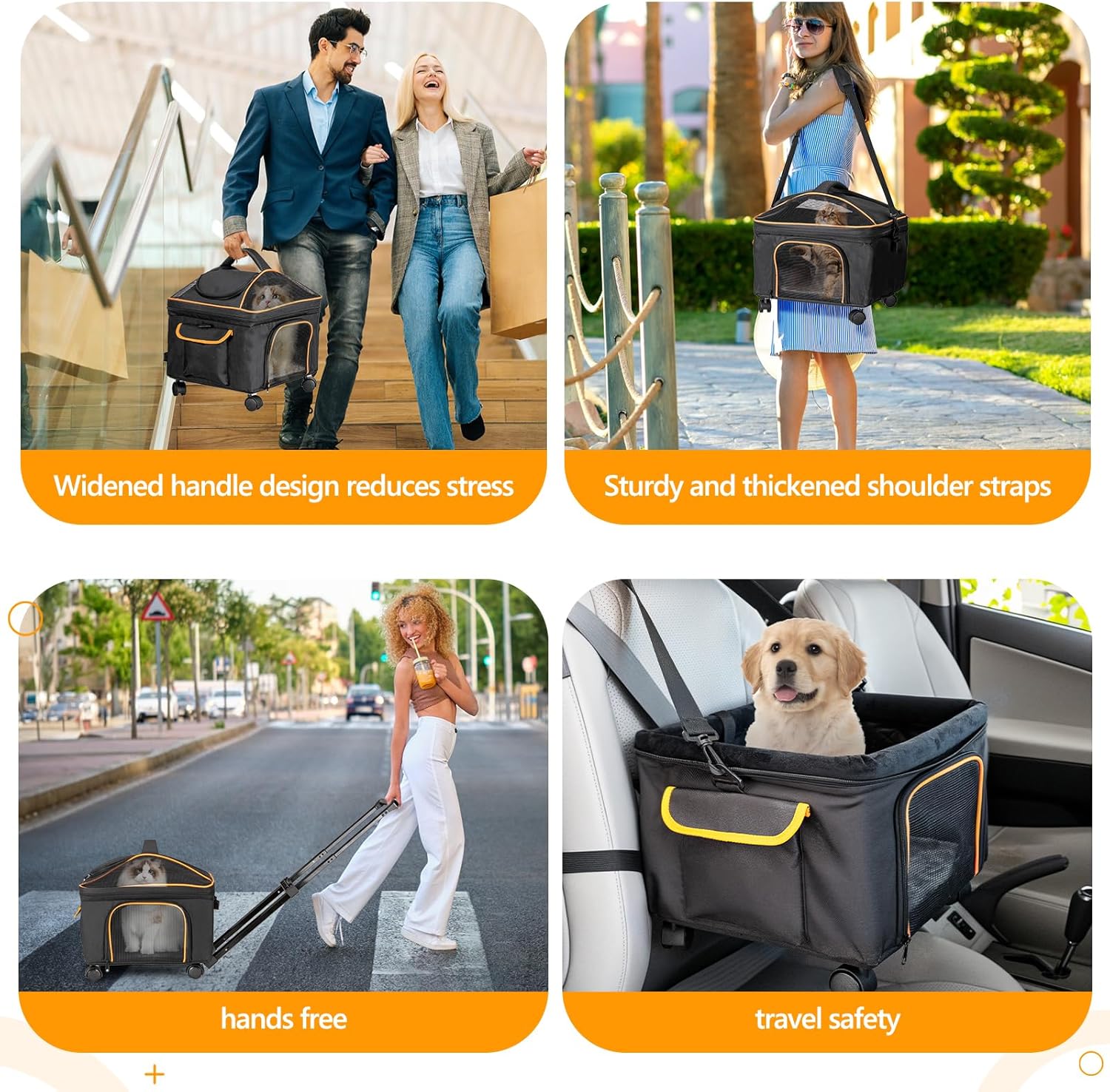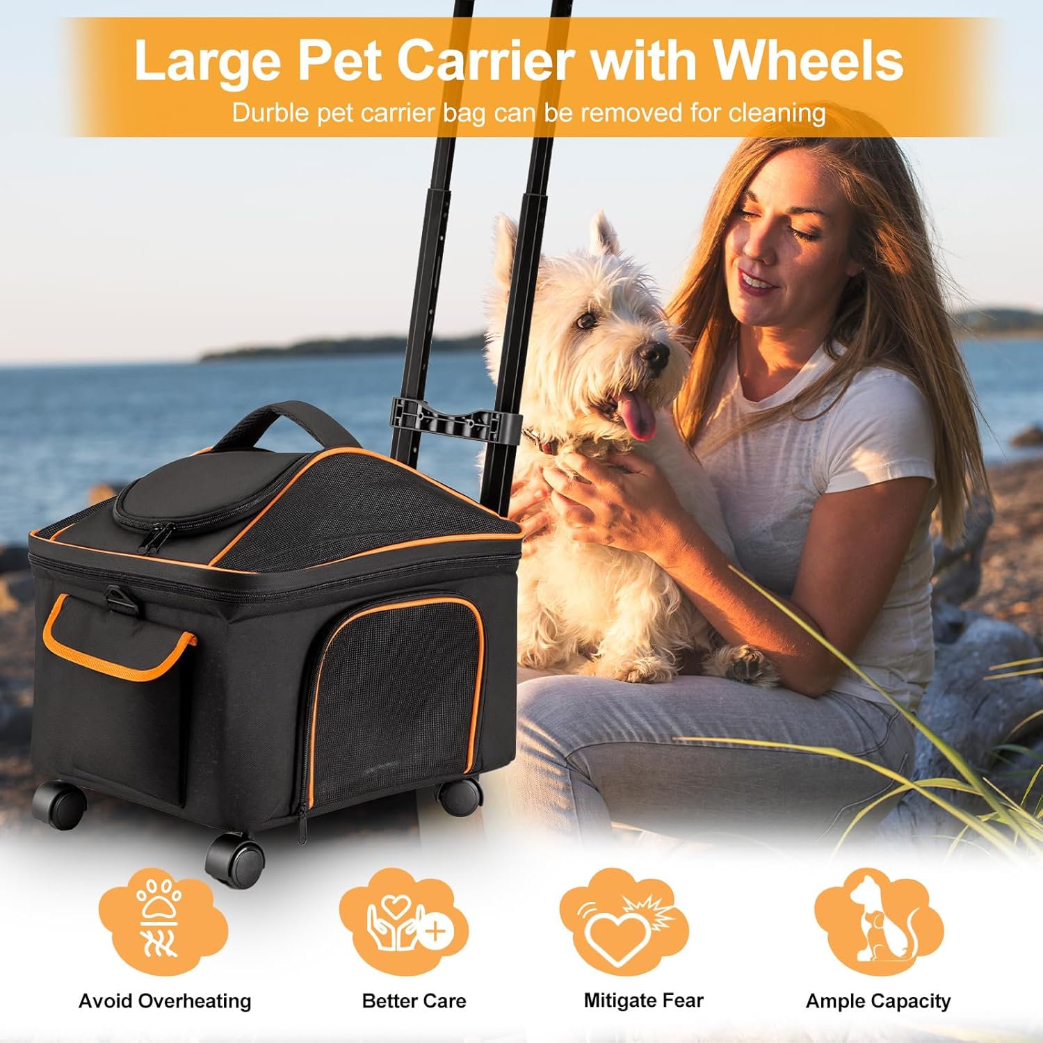 - WHEELS SWIVEL AND SLIDE EASILY: This rolling pet carrier with wheels has four universal wheels. This structure ensures your pet experiences a smooth and safety journey. And a telescopic handle make it convenient for travelers.