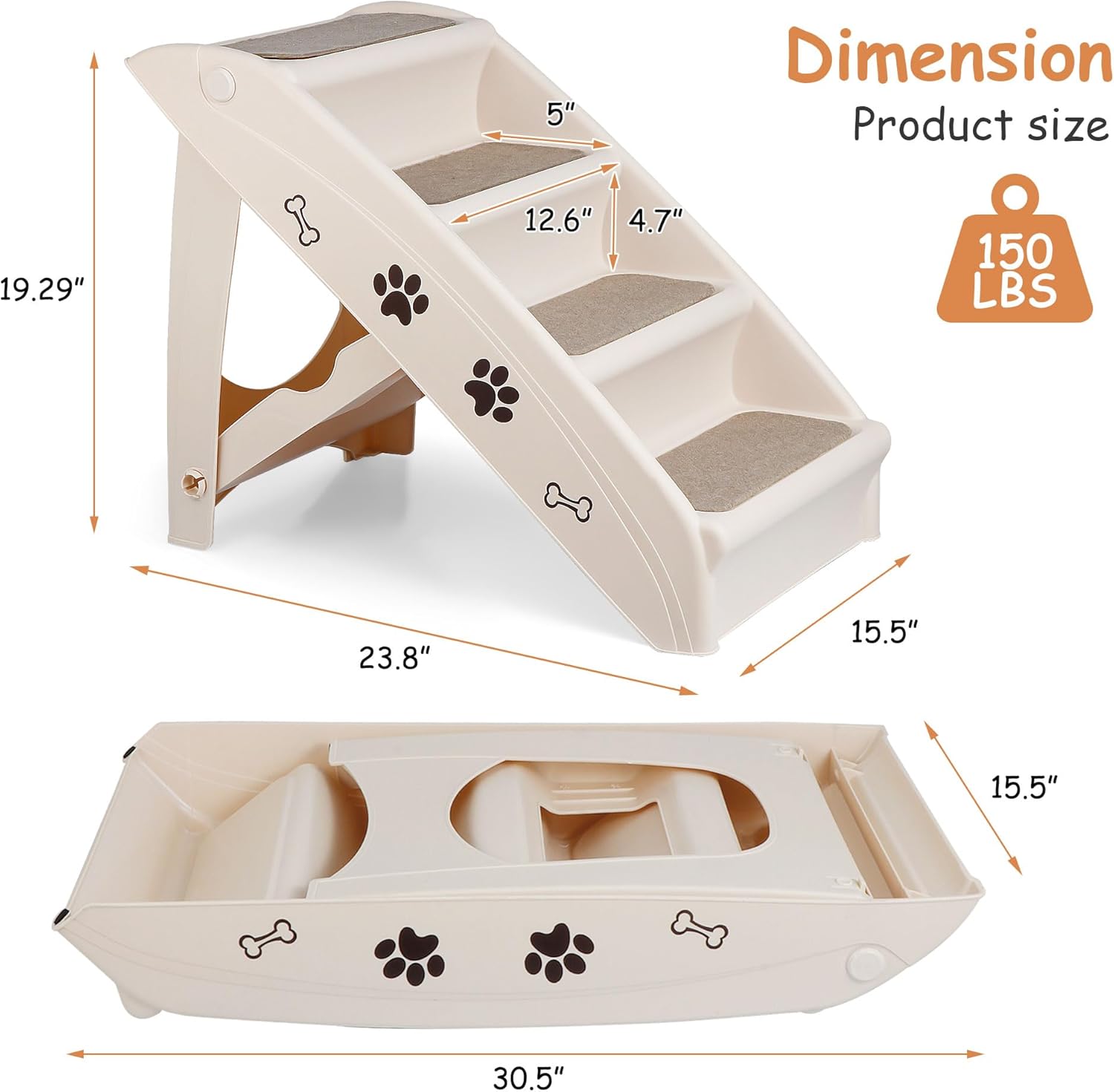 - The 4 step pet stairs are super lightweight and weigh only 5 lb, but are strong enough to support up to 150 lb. Built in foldable design, you may easily folds it under your bed or inside a closet; Lightweight design allows you move it from room to room without any hassle
