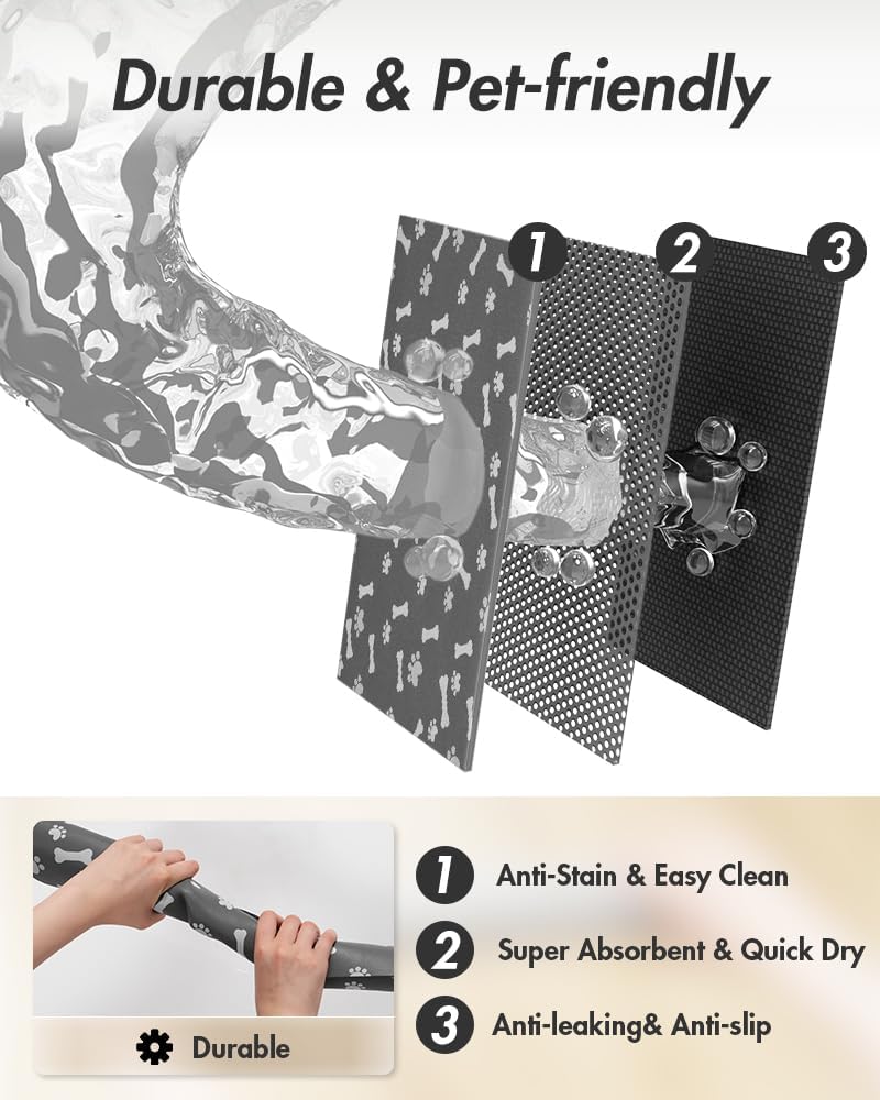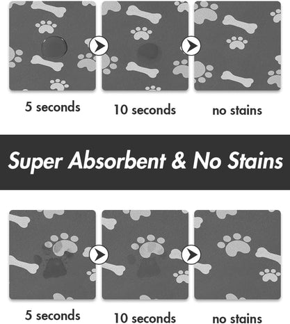 Absorbent & No Stains: Perfect dog accessories.This dog food mat can stop water from overflowing. Super absorbent and quick-dry ability can avoid wetting pet paws even for messy drinkers. No marks will be left when food and water are dropped on the pet food mat. keep any pet owner floors clean and dry while also ensuring that their pet's feeding area is comfortable and safe.