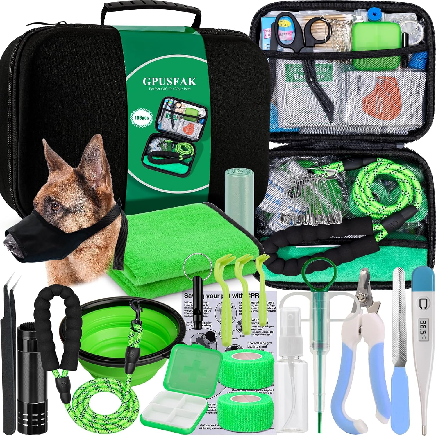 - FIRST AID KIT FOR PETS: Do you have an active pet such as dog? Then you definitely need this pet first aid kit. It contains USUAL CARE SUPPLIES like pet feeder kit, microfiber towel, etc