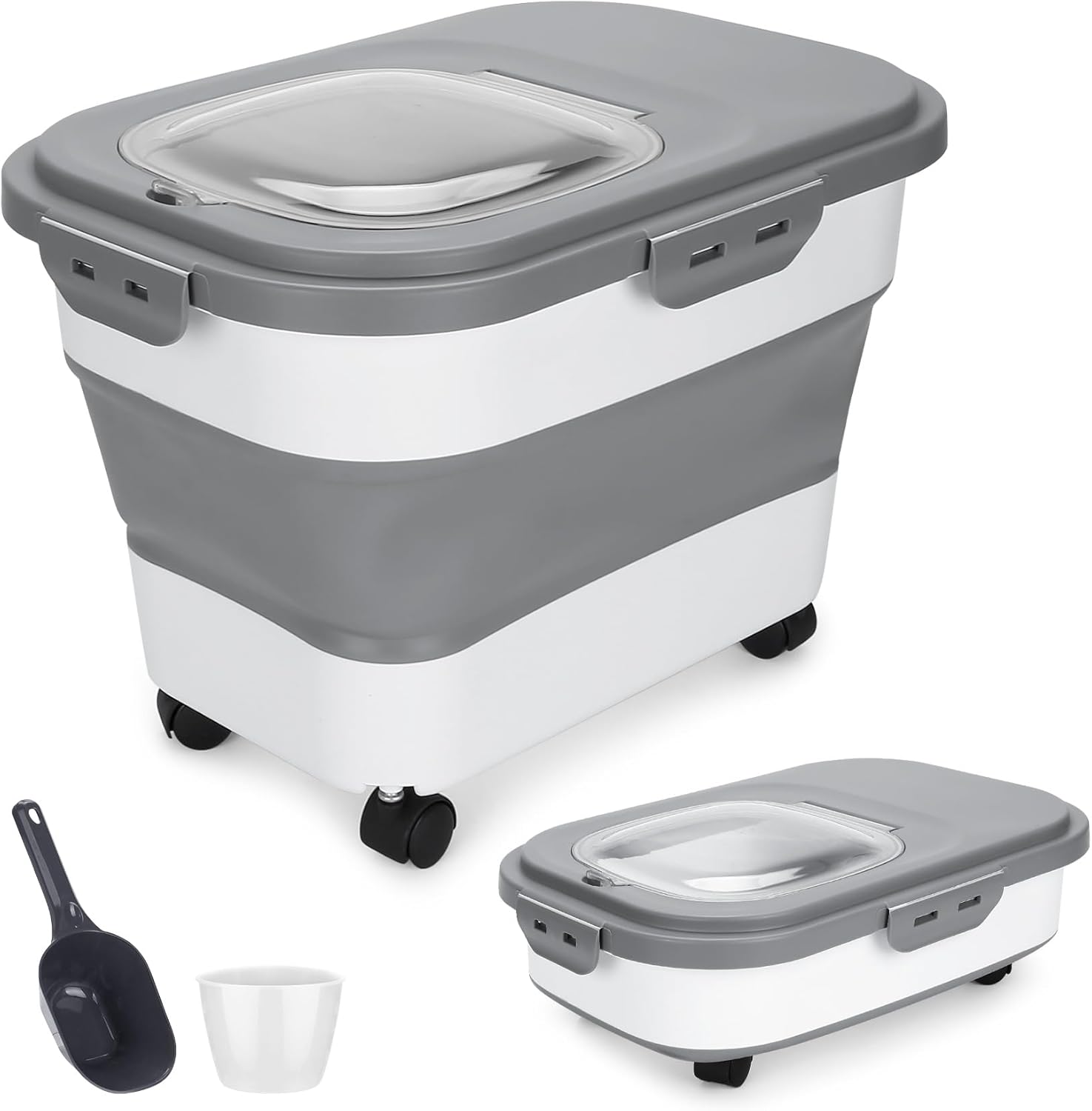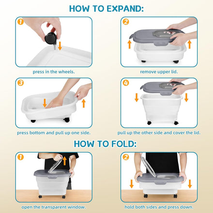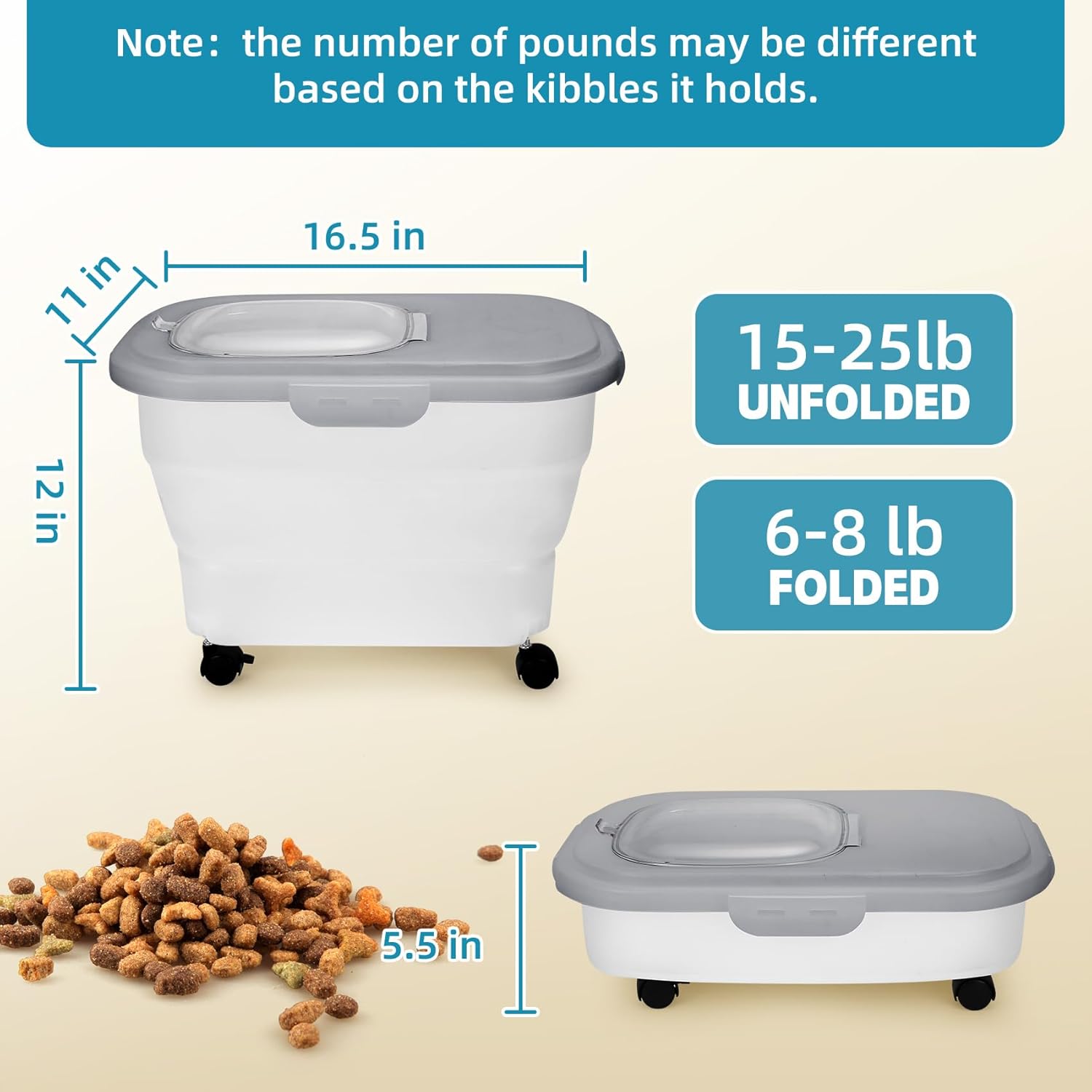 - 🐱【Collapsible to Save Space】: It's your choice to make the cat food storage container small or large. The expanded size is 16.5in * 11in * 12in, can hold 15-25lb dog/cat dry food, and the folded size is 16.5in * 11in * 5.5in, can hold 6-8lb depand on the cereals it hold. When the dog food holder is half empty can collapse the container down for space saving, and also convenient for taking for travel.